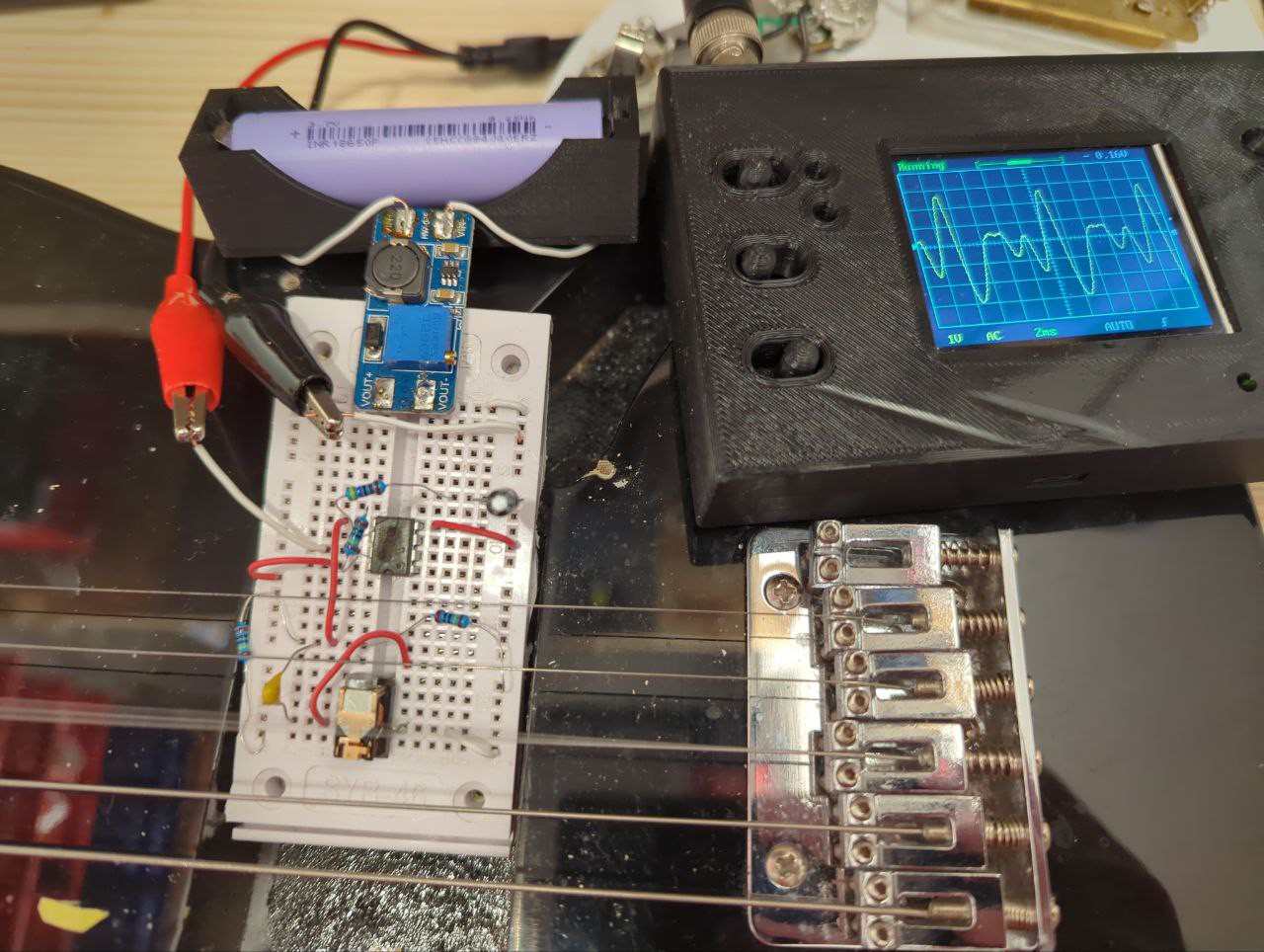 Later when reading about the component abuse challenge on Hackaday something clicked in my brain. In the description an ignition coil was mentioned and I thought "hey, every coil is a pickup coil if you're brave enough". Not just tape heads, but electric motors, magnetic valves, ignition coils, wireless charging modules, lots of stuff has coils inside, which could pick some of the magnetic field of a vibrating magnetized string.