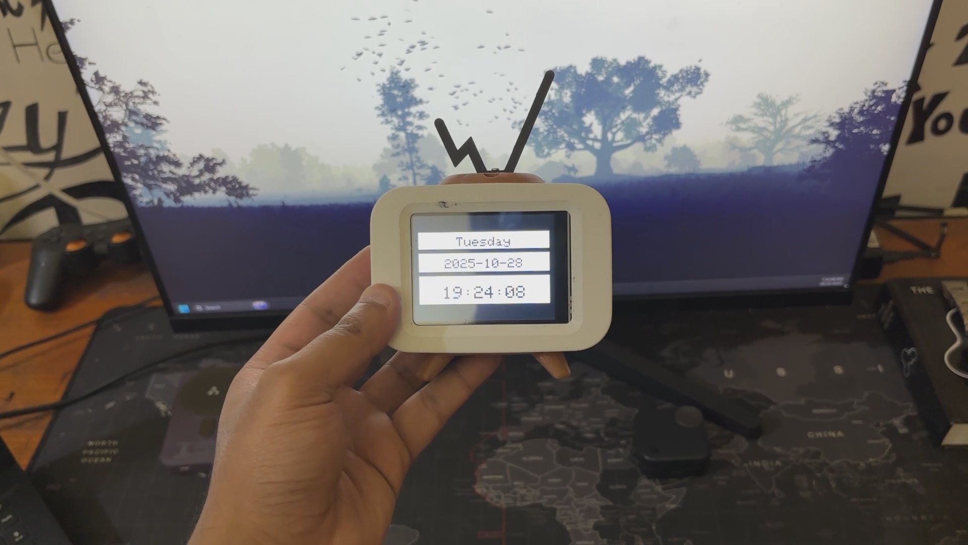In clock mode, it fetches time, date, and weekday data via NTP and displays it in crisp white panels with bold black cut-out text.