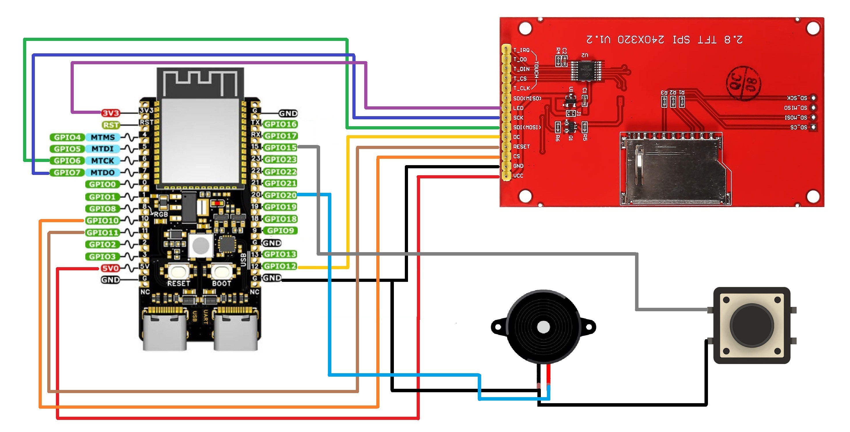 For wiring, I followed a simple diagram that connects the ILI9341 display to the ESP32-C6 via SPI, along with a few additional GPIOs. The setup includes connections for a mode-switch button and a buzzer, making the entire circuit compact and easy to replicate.