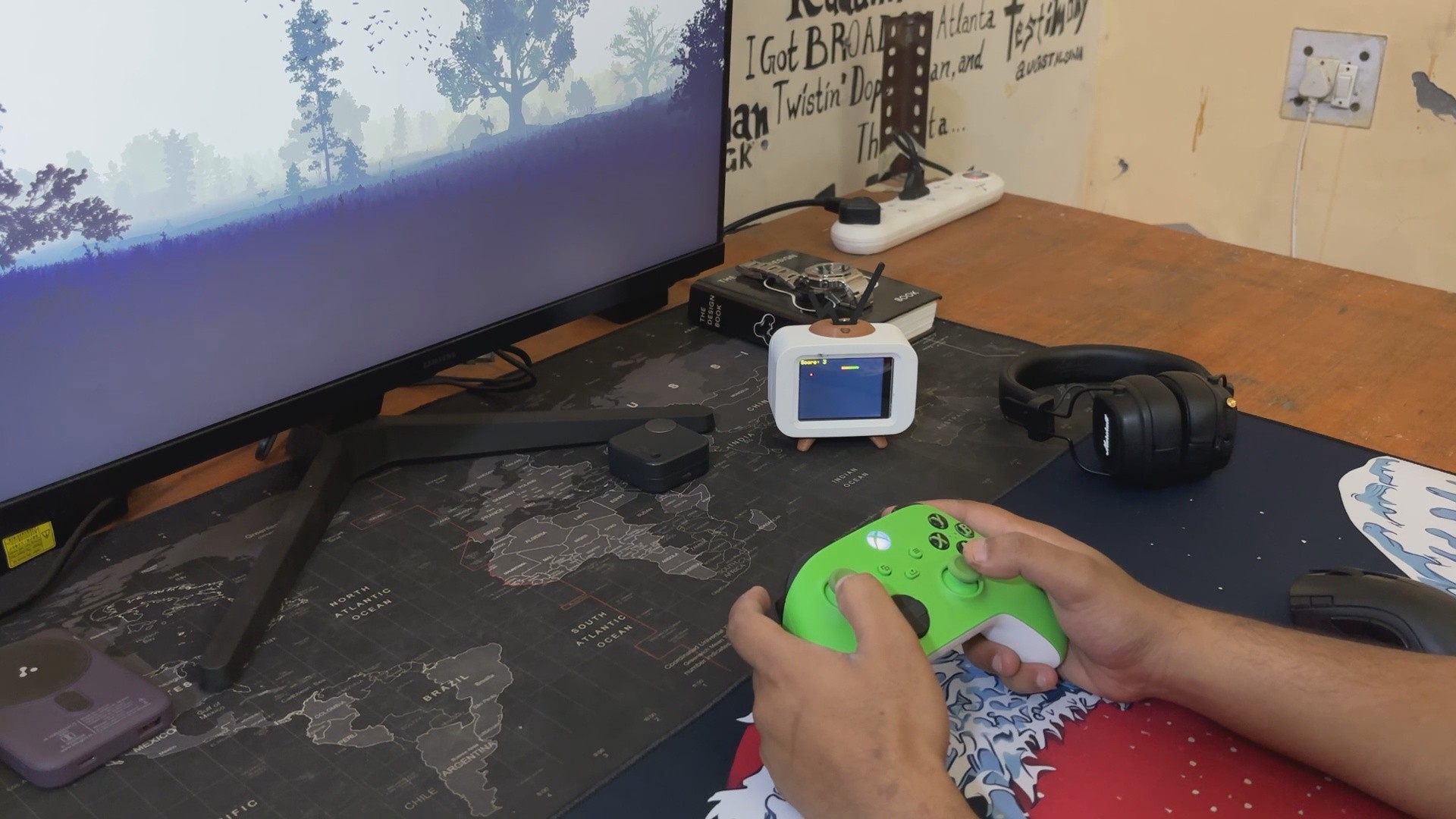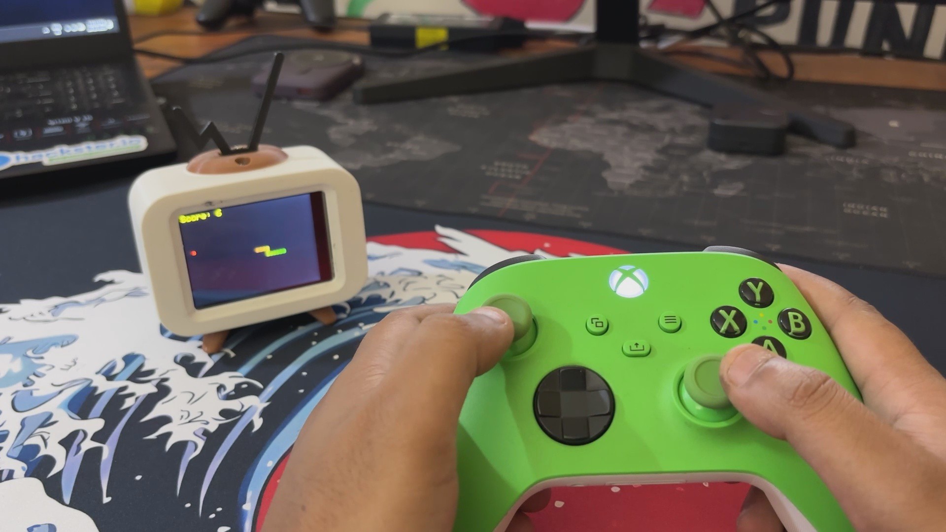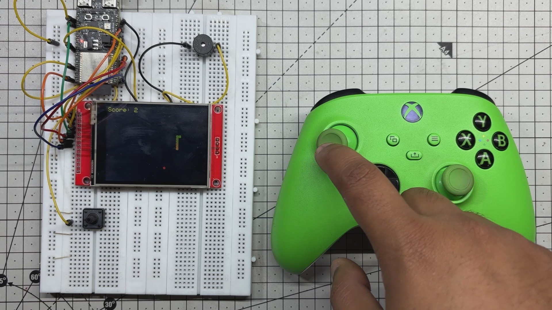 The game logic is handled through a dedicated ESP32 library called BLEGamepadClient, which makes the Xbox controller pairing seamless. A buzzer adds tactile feedback when food is picked up, and a mode-switch button toggles between clock and game modes.