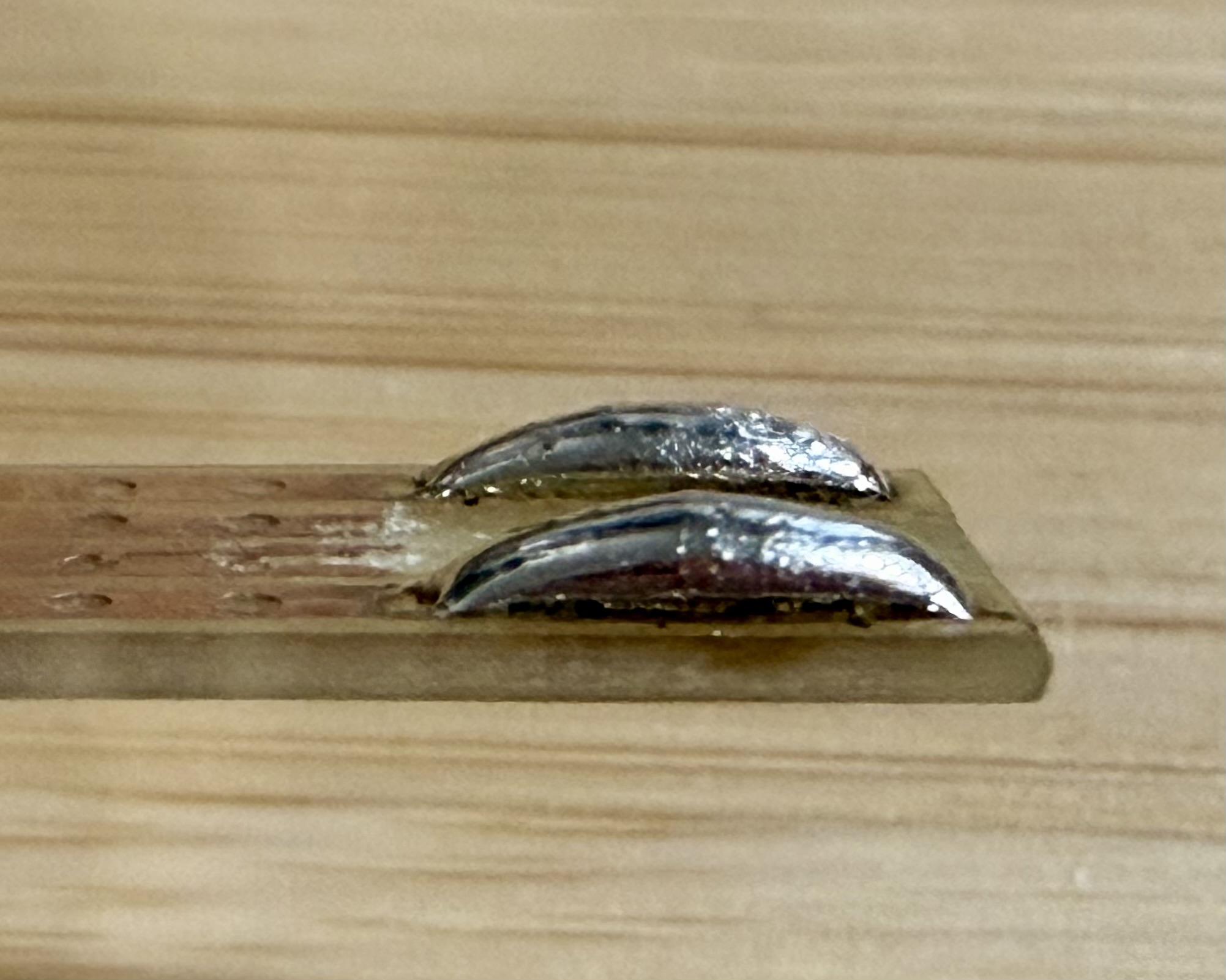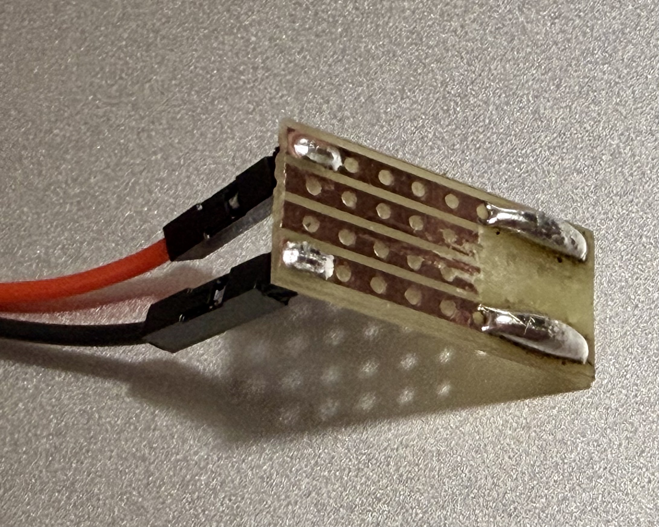 The pitch of the conductors within the USB-A shell is 2.5 mm, 2.0 mm and 2.5 mm, so a 4-hole wide piece of perf-board gives almost exactly the right spacing between the 5 v and 0 v pins. Scraping away the two central conductors on the strip-board ensures we don't short anything out.