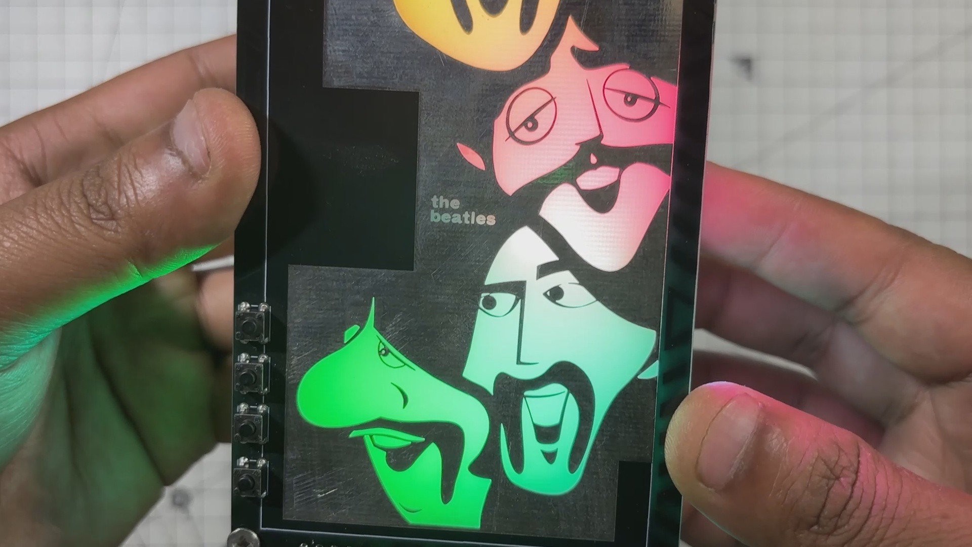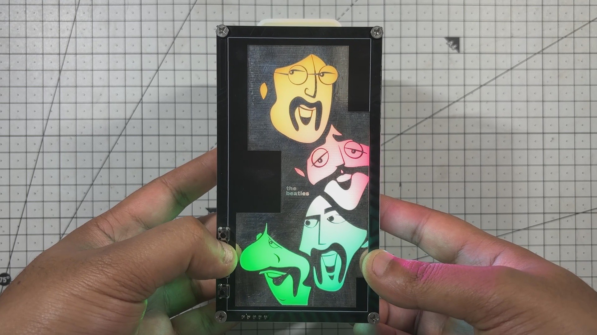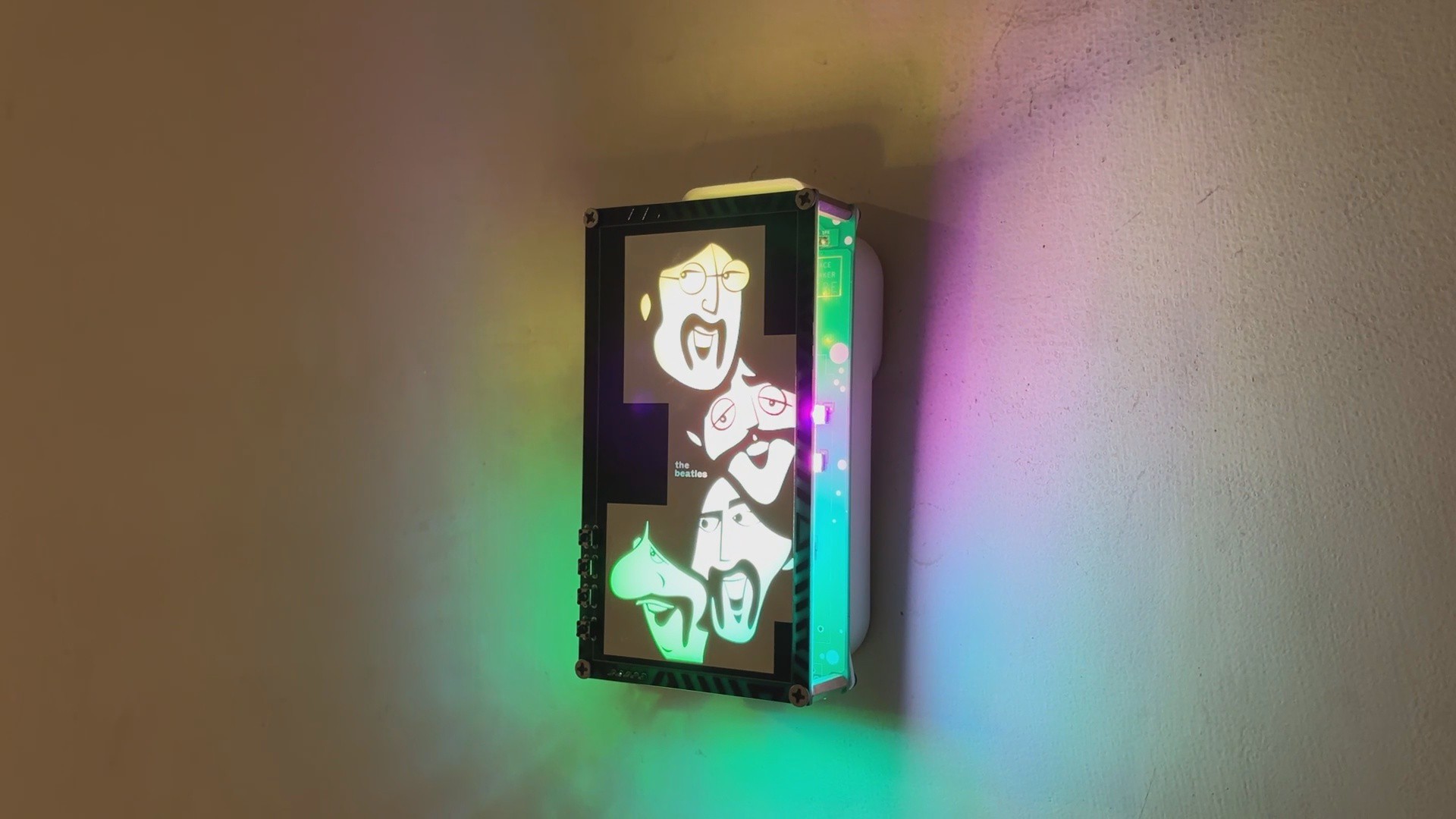 Here’s the end result of this simple yet fun build-a Beatles-themed art-light music player that’s hard to categorize. It plays a selection of Beatles songs stored on an onboard SD card and features a custom front panel with cartoon-style illustrations of the four original Beatles members.