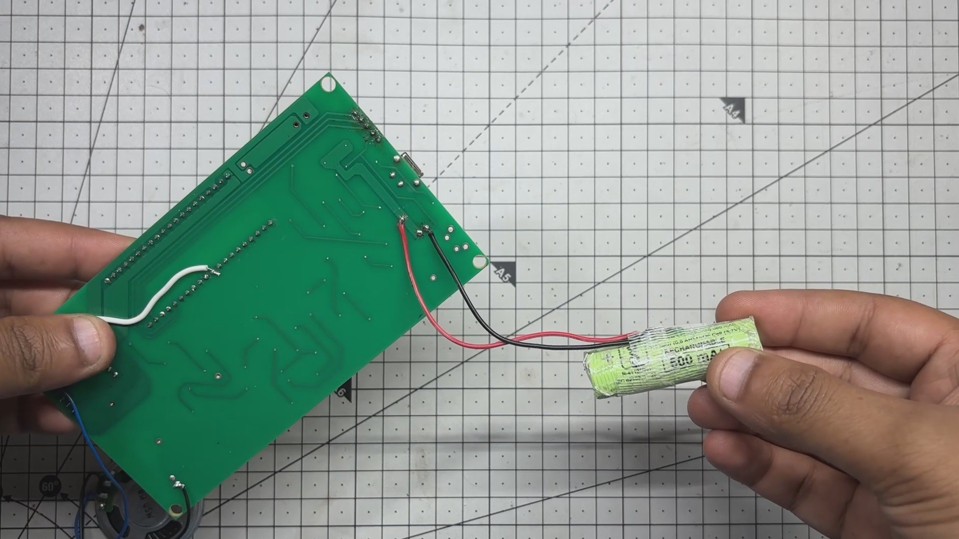 The positive and negative terminals of the 14500 cell were soldered directly to the board’s battery connector using a soldering iron, completing the power circuit.