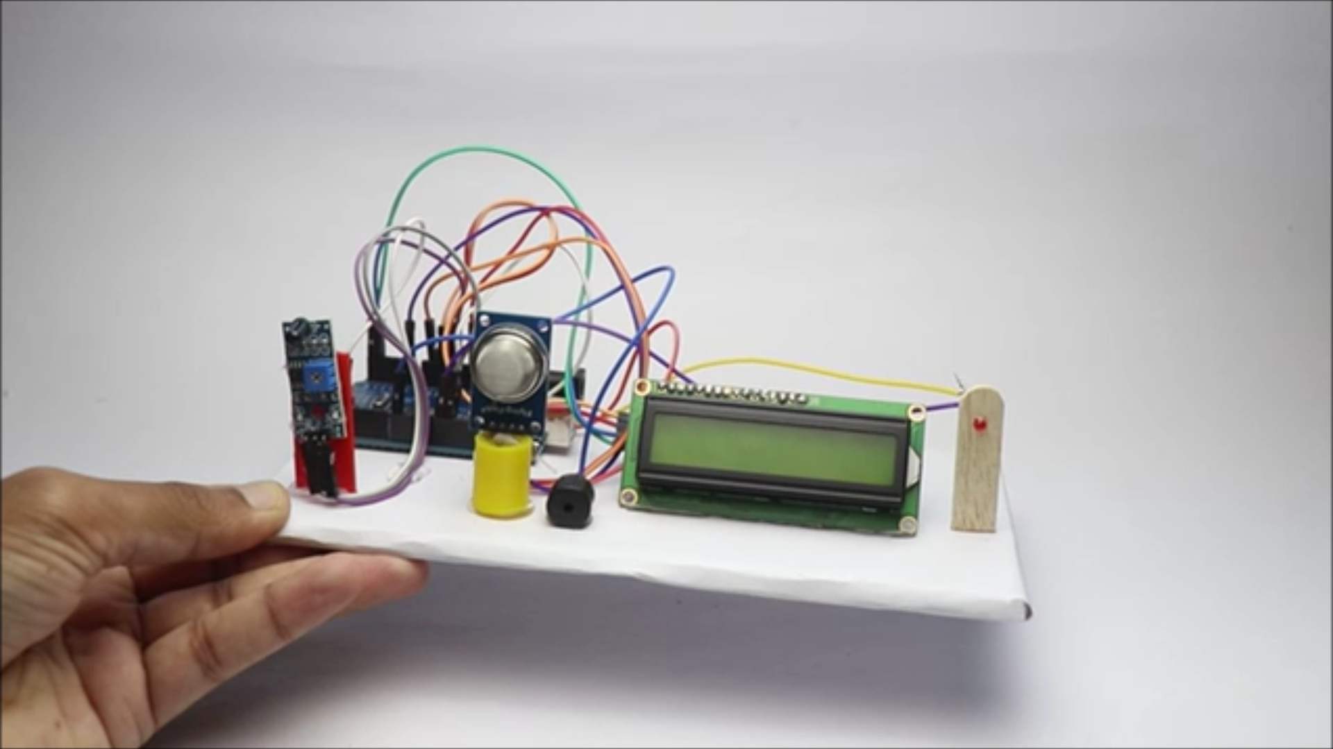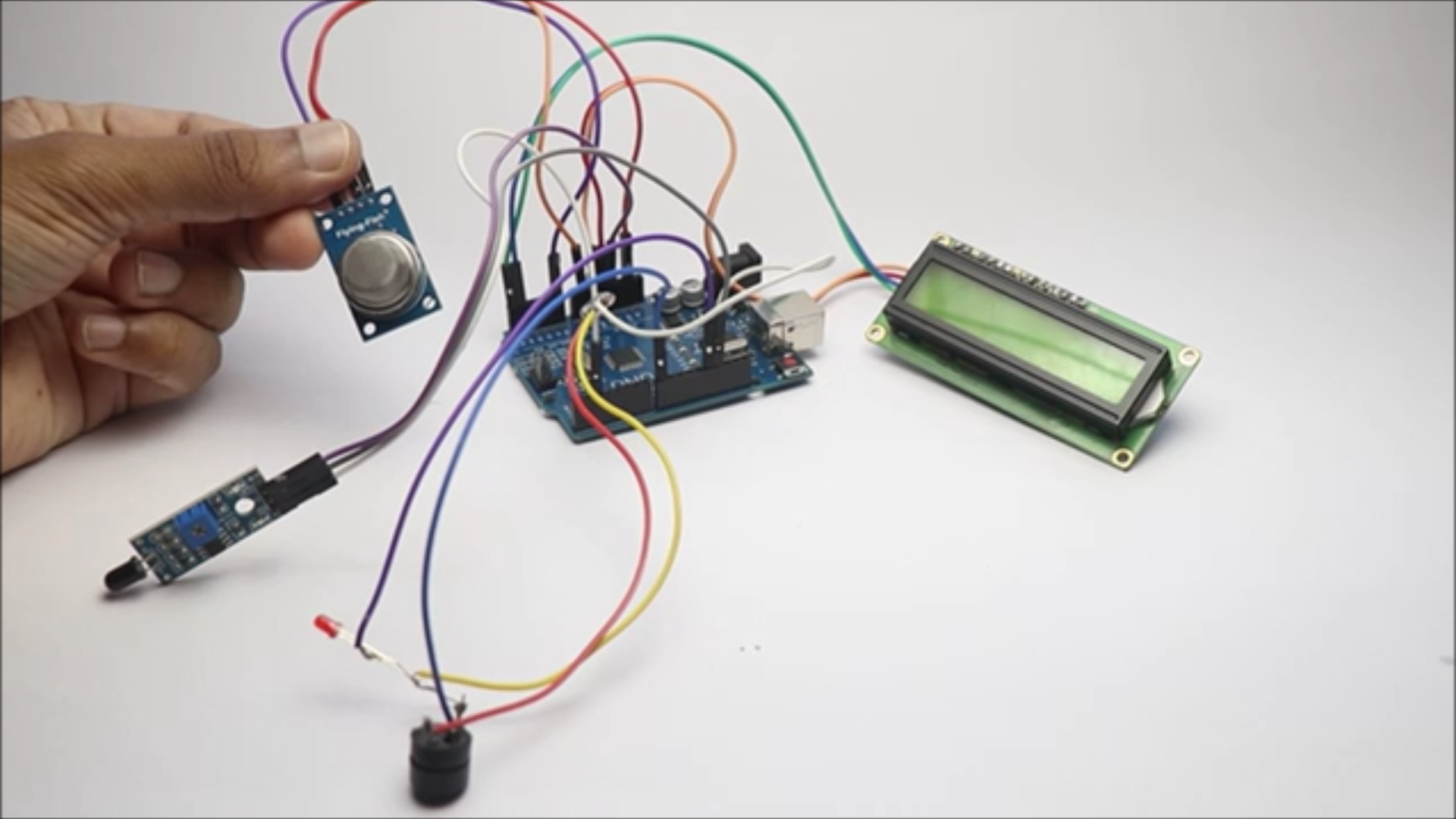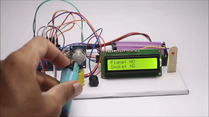 Untill the sensor stops sensing the gas or flame the buzzer will beep, You can take this project one step further by connecting water spray pump also instead of LED.