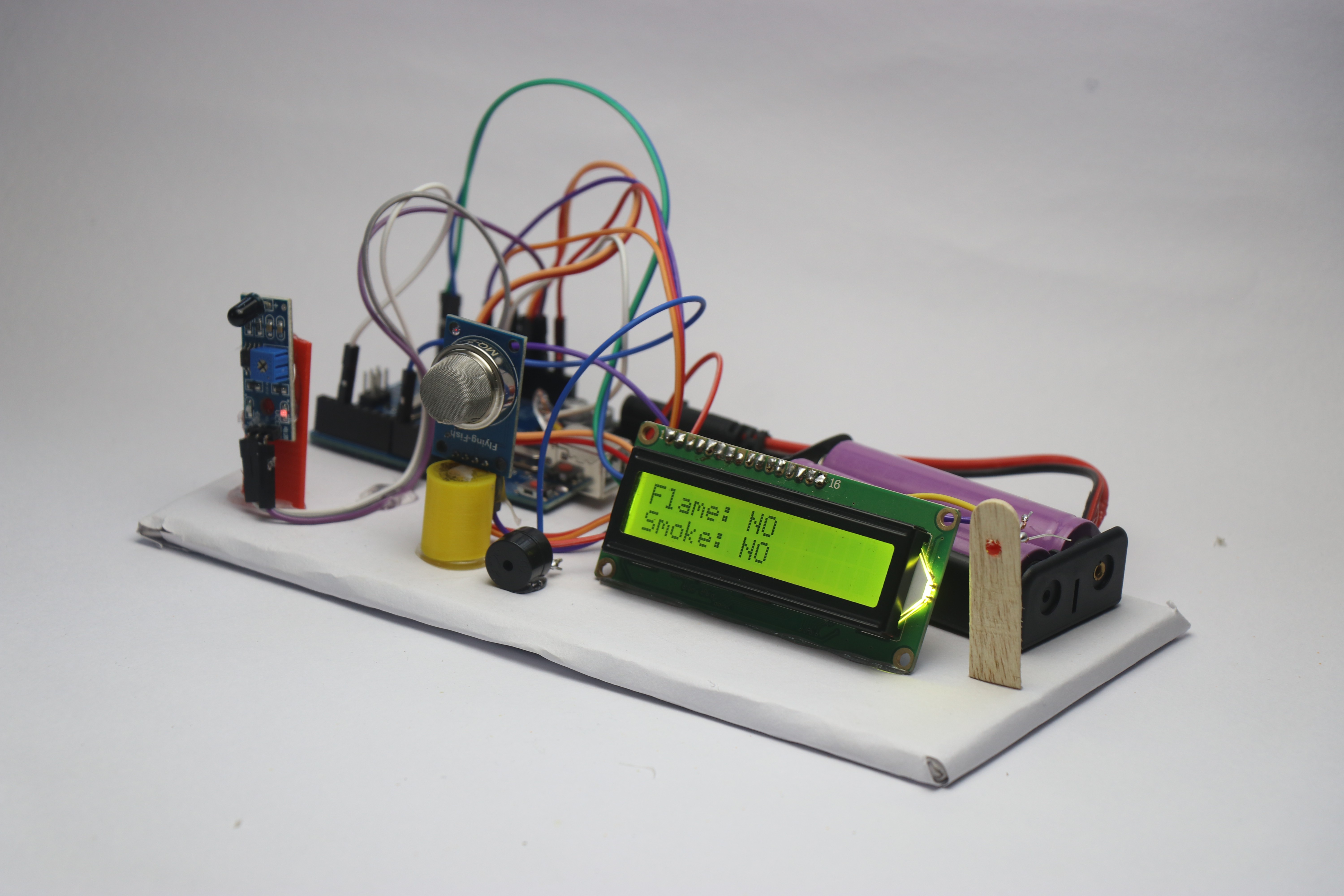 Now you can test the project, I used lighter for flame and when you bring it near to the flame sensor the red led glows along with buzzer and the LCD shows flame detected as Yes.