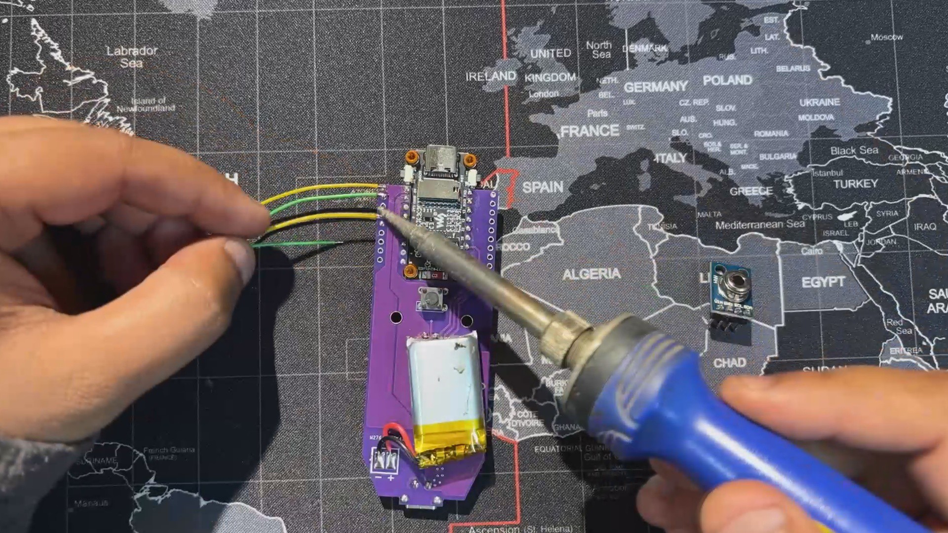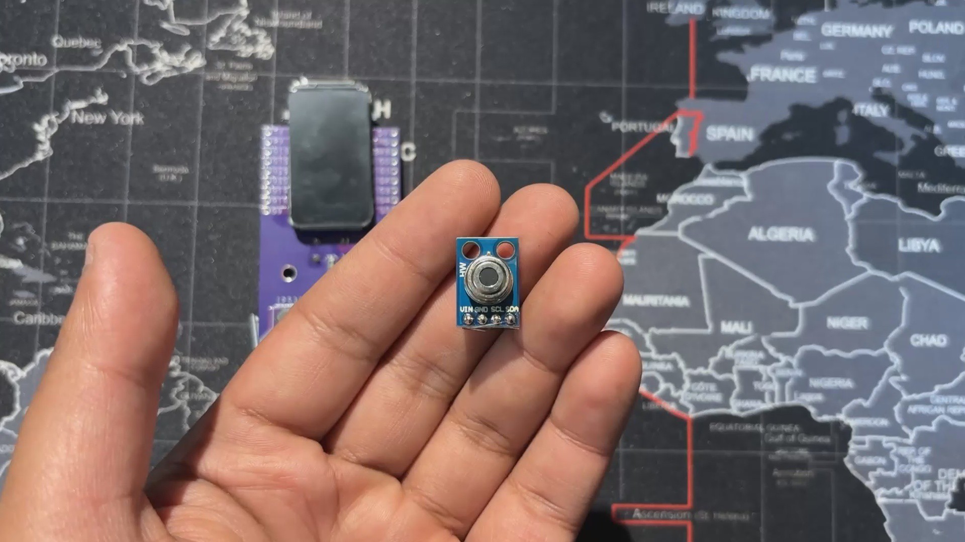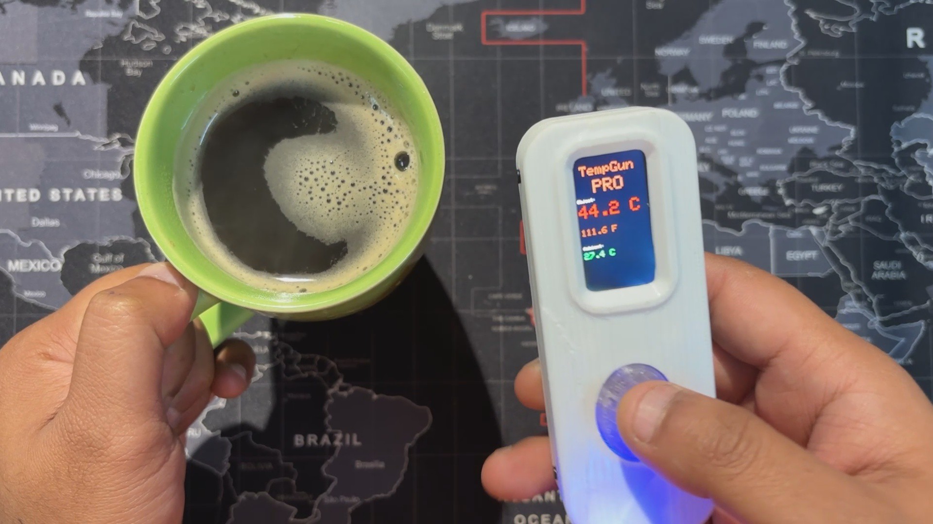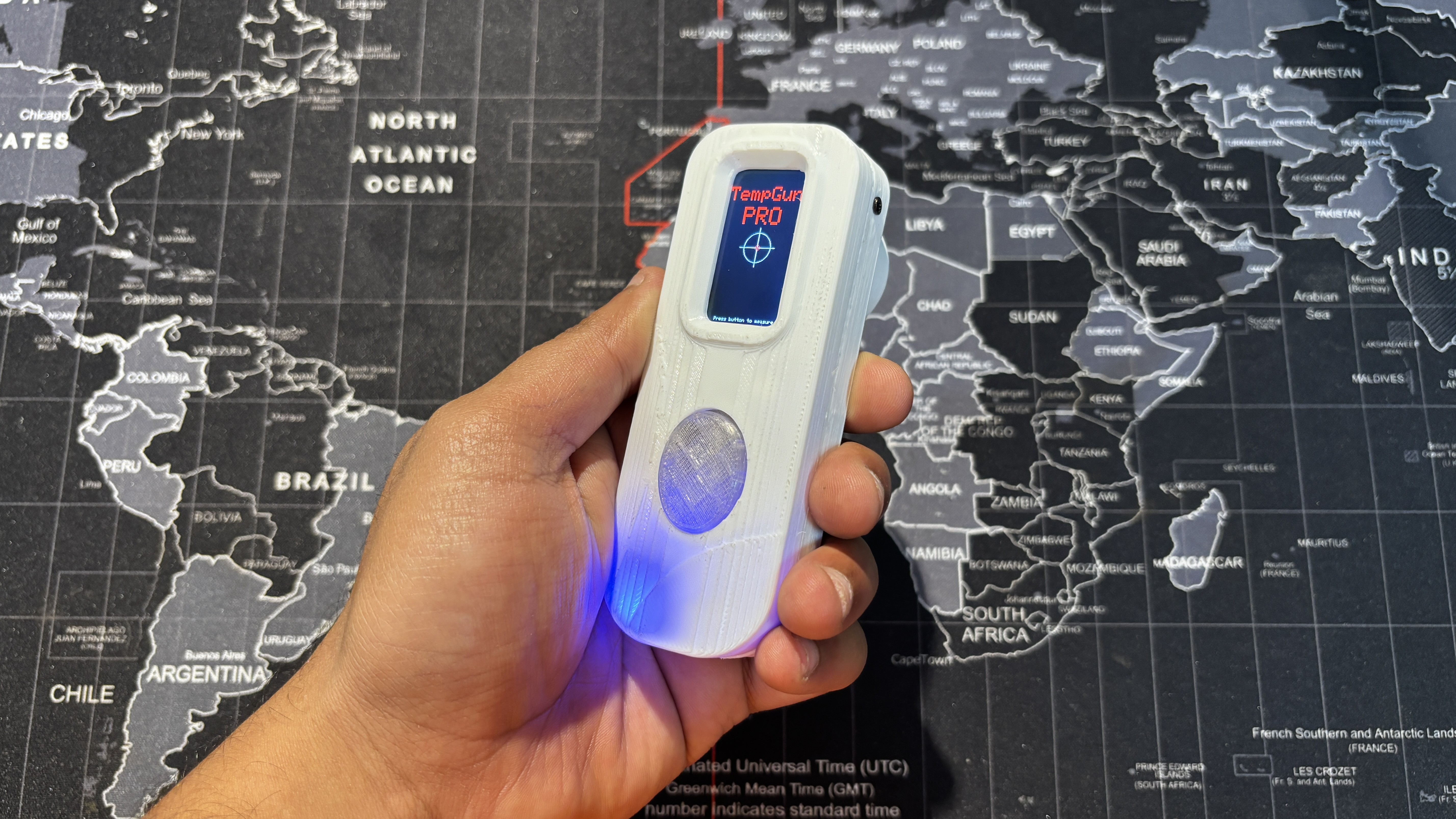 The best part was how easy it was to build. I reused my earlier Medic Mini project, an ESP32‑C6 dev board with a screen, buttons, and battery circuit. I just added an MLX90614 infrared temperature sensor to the GPIO pins, wrote up a quick code, made an enclosure, and the project was ready.