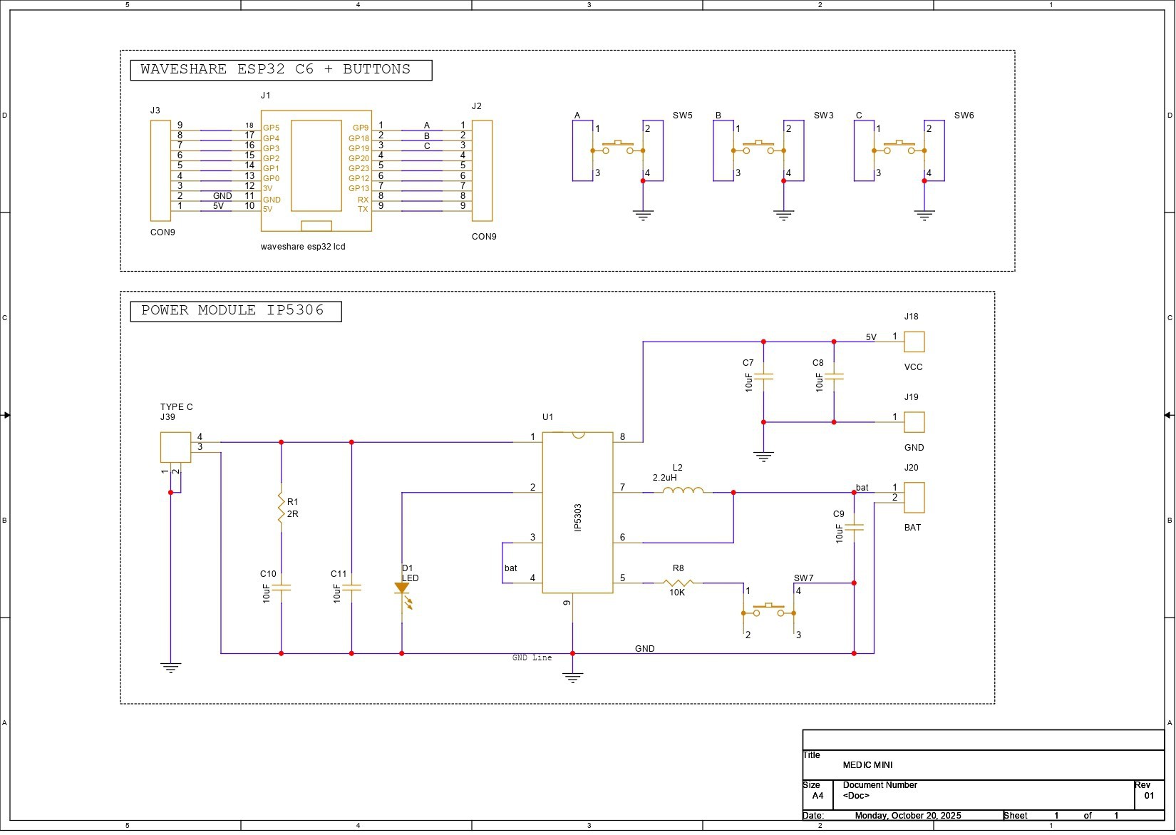 This is a schematic of the Medic Mini PCB design, which is split into two main sections. First, we built the schematic around the Waveshare ESP32-C6 Dev Board, which connects to three tactile buttons for user input. These buttons are wired to GPIO9, GPIO18, and GPIO19, with each switch also tied to GND. When a button is pressed, the corresponding GPIO pin is pulled low, registering a valid input. We will be later using GPIO18 as a temperature reading button! and will be using GPIO4 and GPIO5 as I2C pins.
