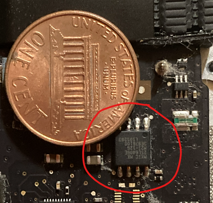 Here are some images of the BIOS/UEFI chip that I took, with a penny for scale.
