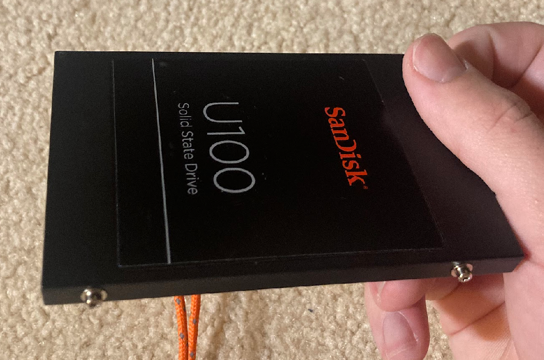 Step 5: Once you have transplanted the cylinder-head screws onto your new drive, you can reattach the ribbon cable and slowly lower it into the slot again. I put Linux on the drive shown below beforehand, so now all I have to do is put it inside the MacBook and boot it.
