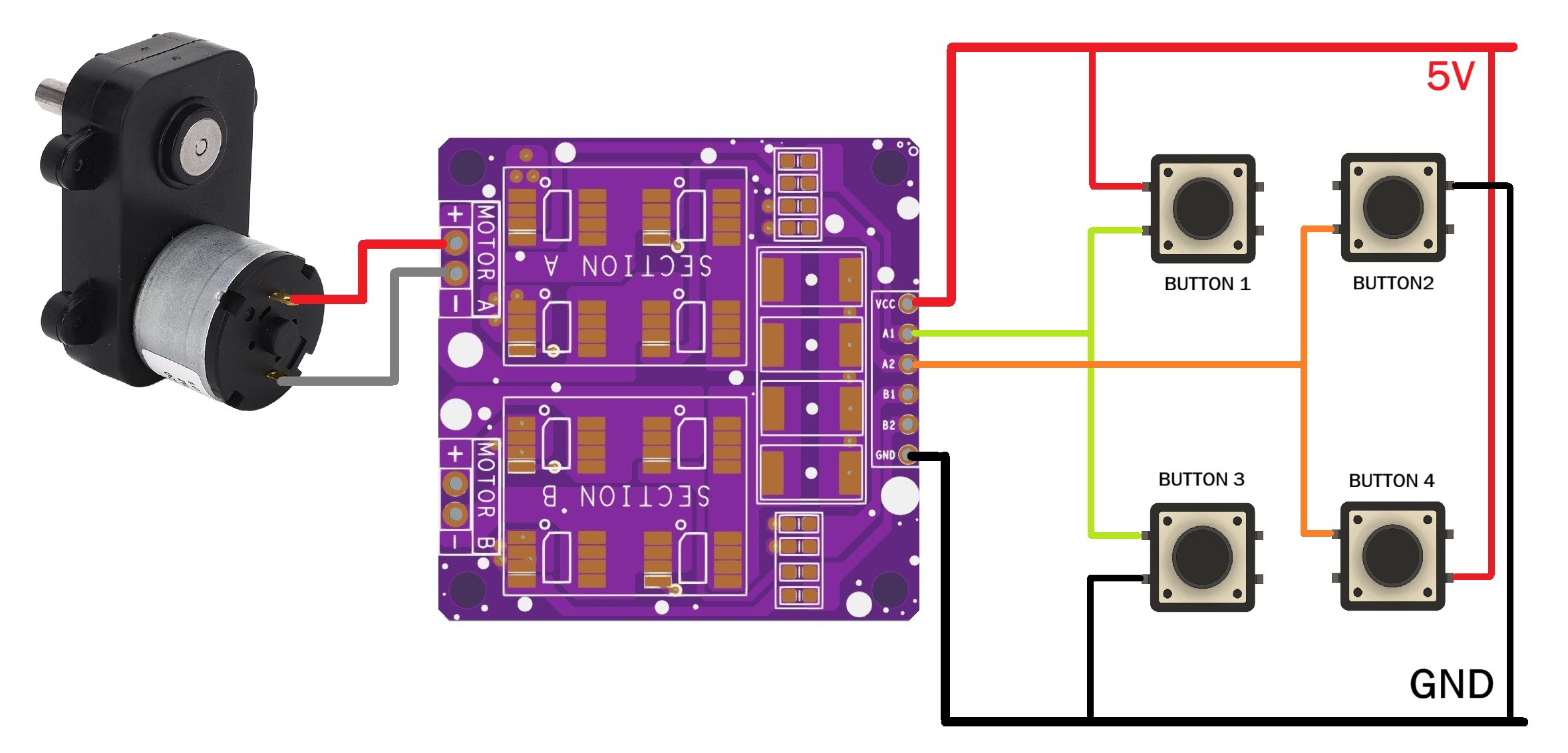 Each MOSFET gate is paired with a 10K resistor. The gates of MOSFET 1 and MOSFET 4 share one input line, while the gates of MOSFET 2 and MOSFET 3 are linked together on the second input line. These two inputs act as A1 and A2. By toggling A1 and A2 HIGH or LOW, we decide the direction of current flow through the motor, which in turn controls the rotation direction.