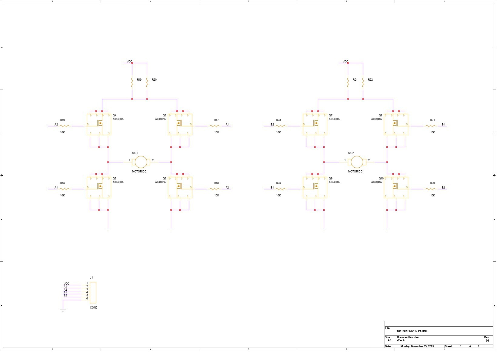 To keep everything neatly connected, we added a CON6 header that brings out VCC, GND, the two inputs for Motor 1 (A1 and A2), and the two inputs for Motor 2 (B1 and B2).