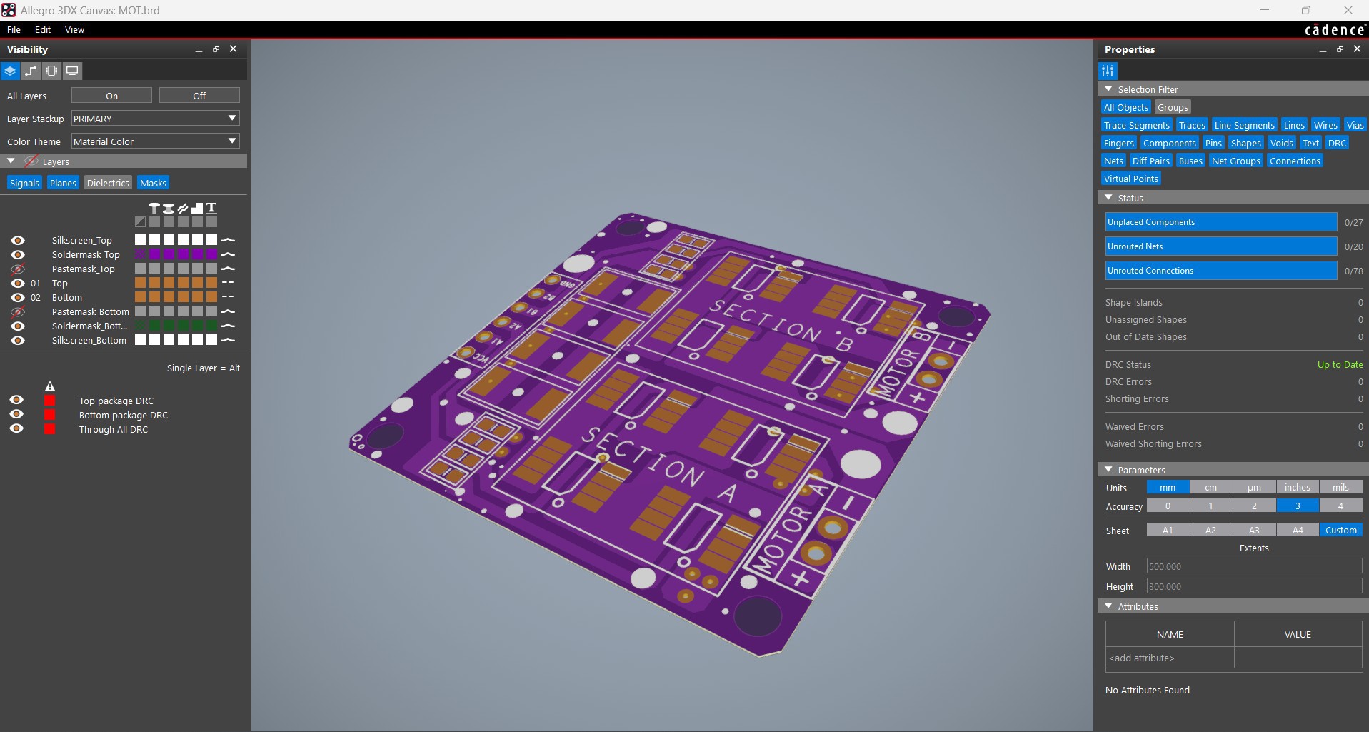 The resistors linked to the MOSFETs for Motor 1 were placed right next to that set, and the same for the resistors for Motor 2. The load resistors, which use a 2512 package, were placed on the top side above the MOSFETs. After that, I routed all the traces, making sure to keep the VCC and GND lines thick, along with the traces leading to both motor connectors—just to handle current properly.