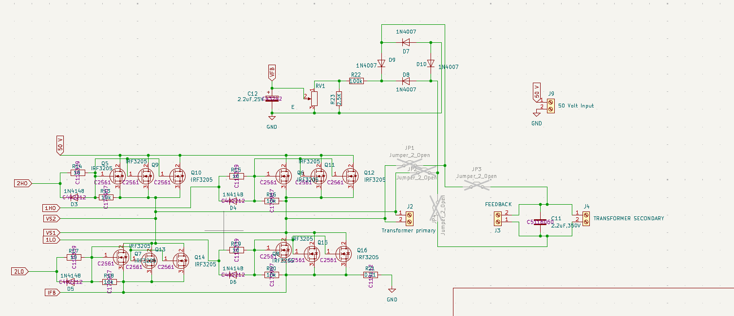 The inverter is built using IRF3205 MOSFETs arranged in a full-bridge configuration. These MOSFETs are driven by the gate driver circuit (IR2110), receiving high-side and low-side control signals (1HO, 1LO, 2HO, 2LO) generated by the LaunchXL F28379D.