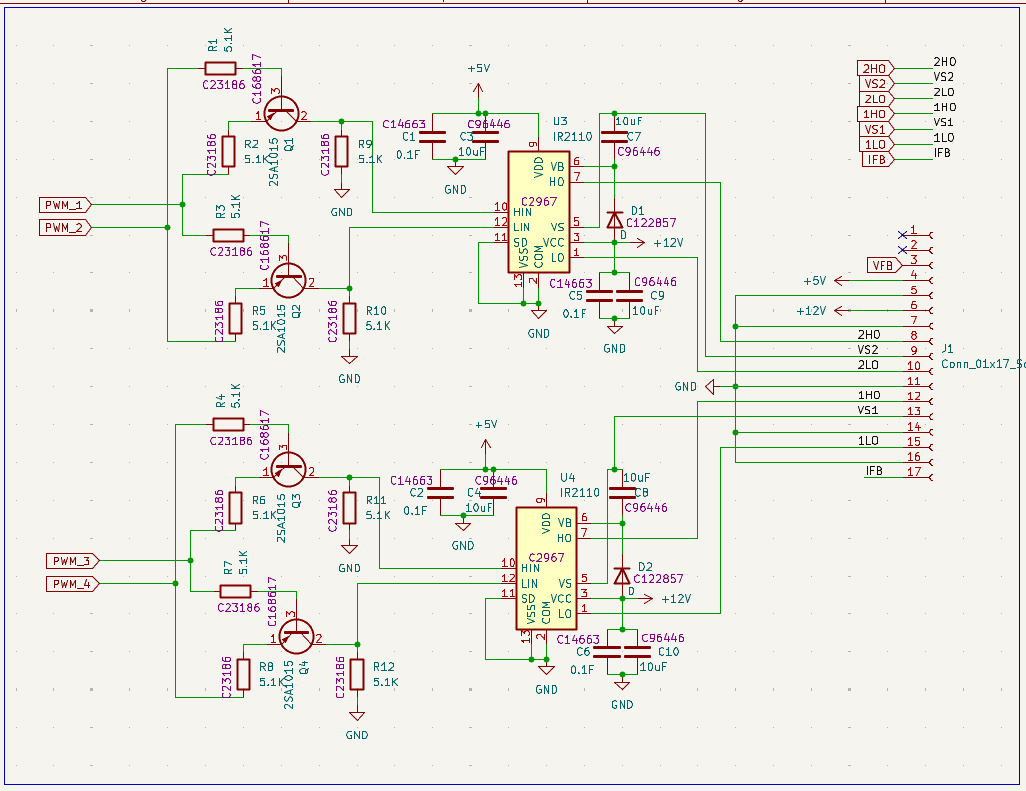 The conditioned PWM signals are then fed into the IR2110 gate driver ICs. Each IR2110 drives one inverter leg by providing:
