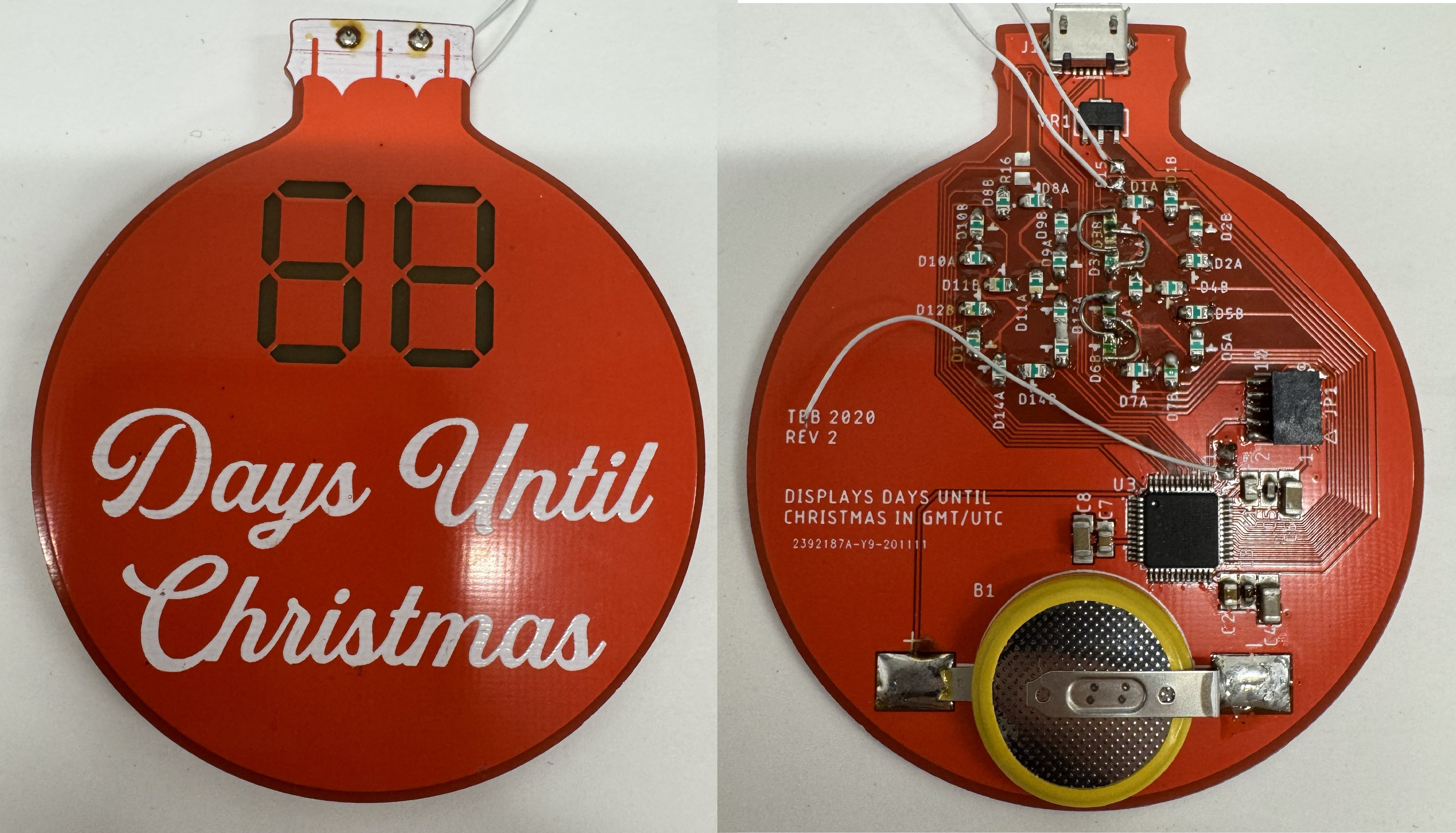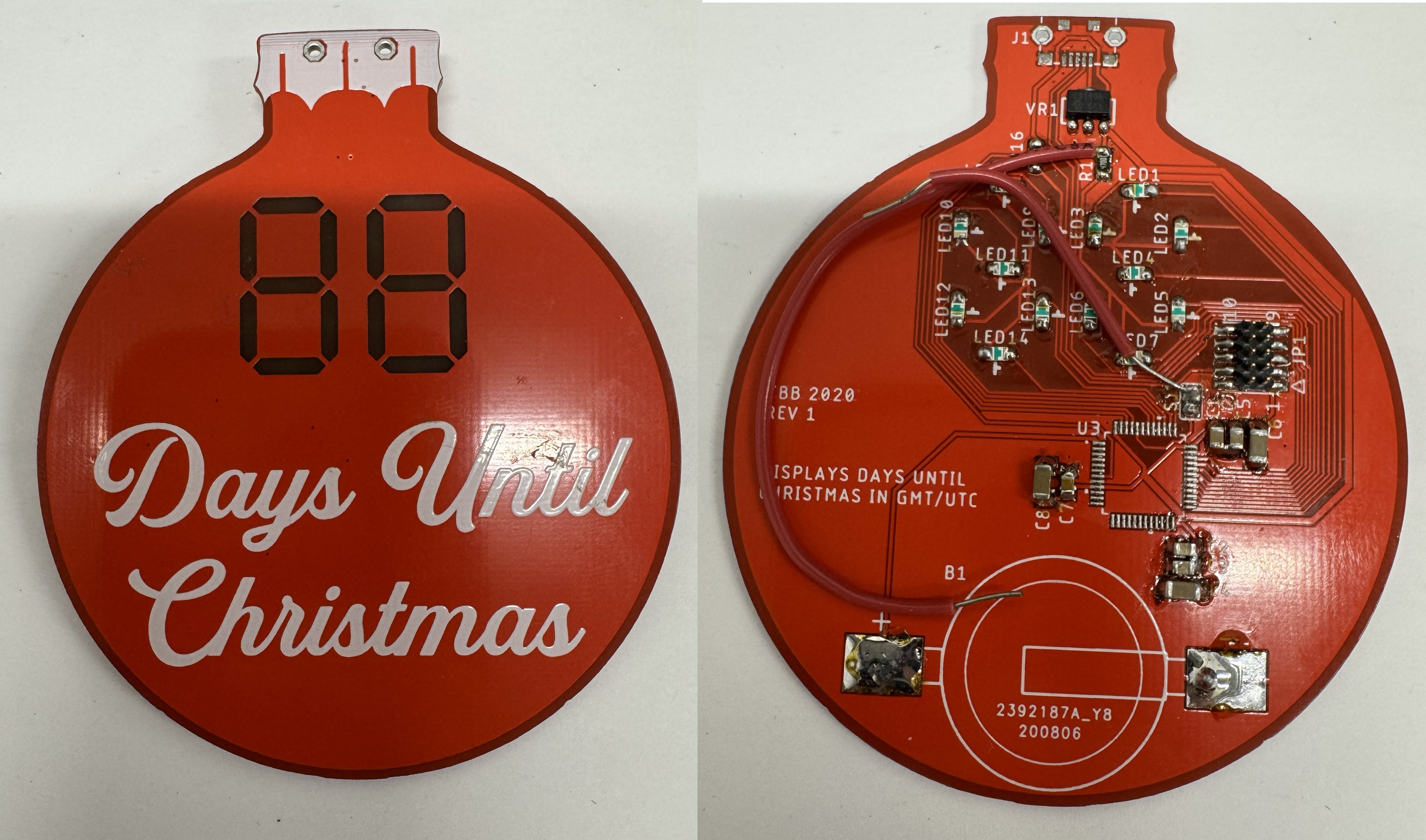 Additionally, a small number of traces were routed on the visible side of the PCB. Ultimately, I really liked the look and this sparked a change in design philosophy for the project. I embraced the visible traces as it made the ornament look more like a techy gadget, and didn't detract from the core purpose which was to display the number of days remaining until Christmas.
