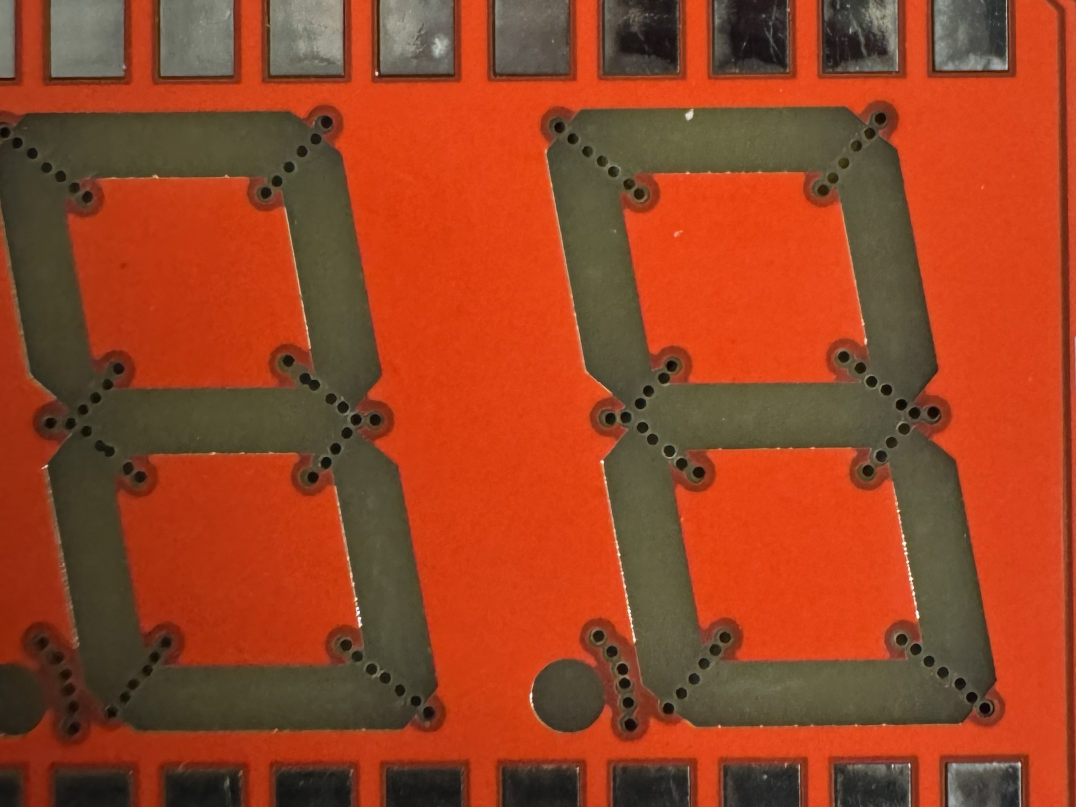 Fed up with the diffusing properties of FR4 and challenges of reverse mounting LEDs, I opted to try using proper seven-segment displays. This was a considerably more expensive solution, but I trusted the optics of a proven solution and didn't want to waste another spin and another year on more guesswork.
