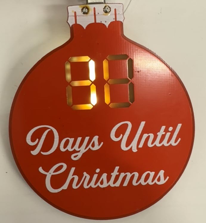 An electronic looking Christmas ornament that counts down the days until Christmas.