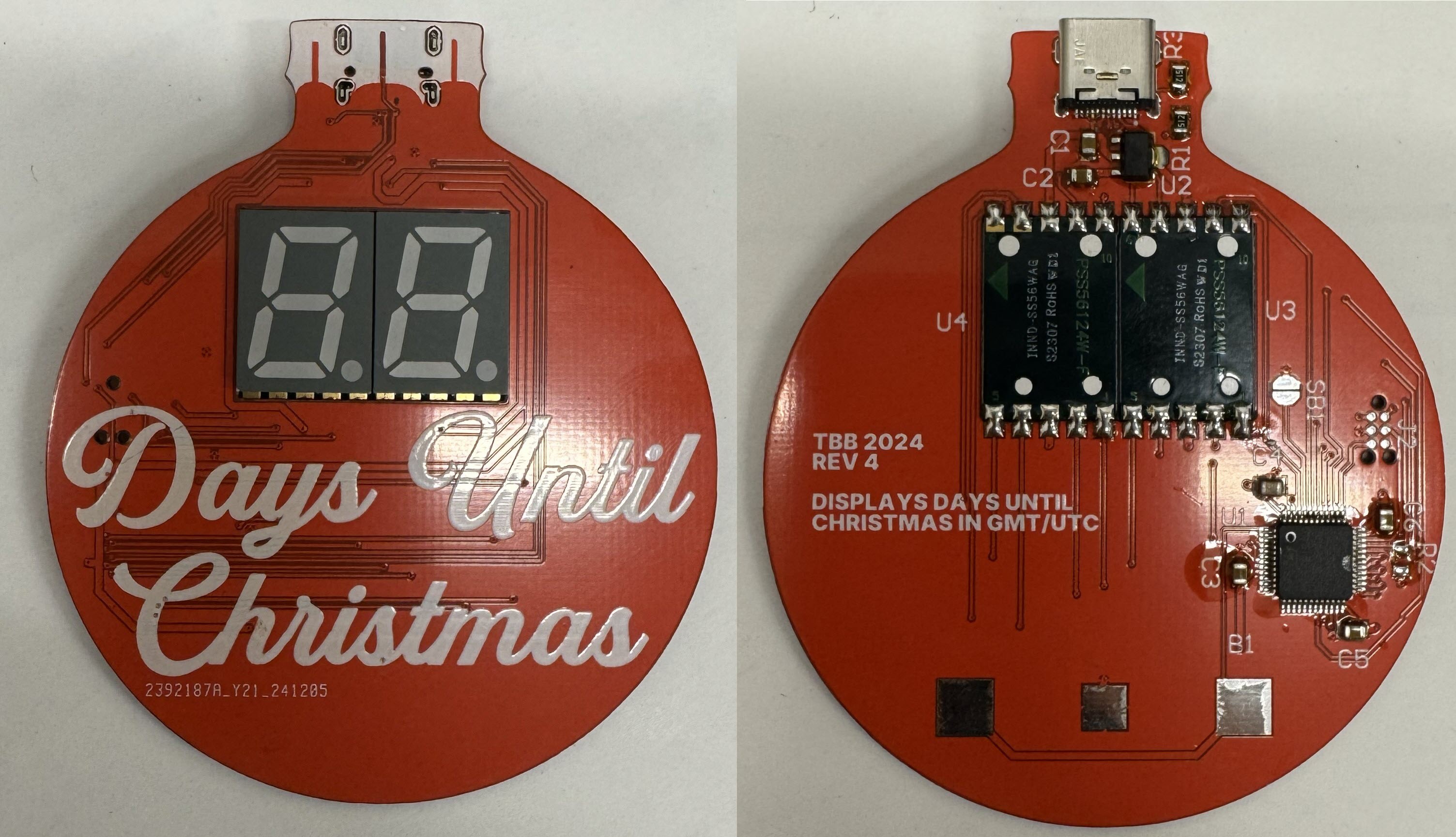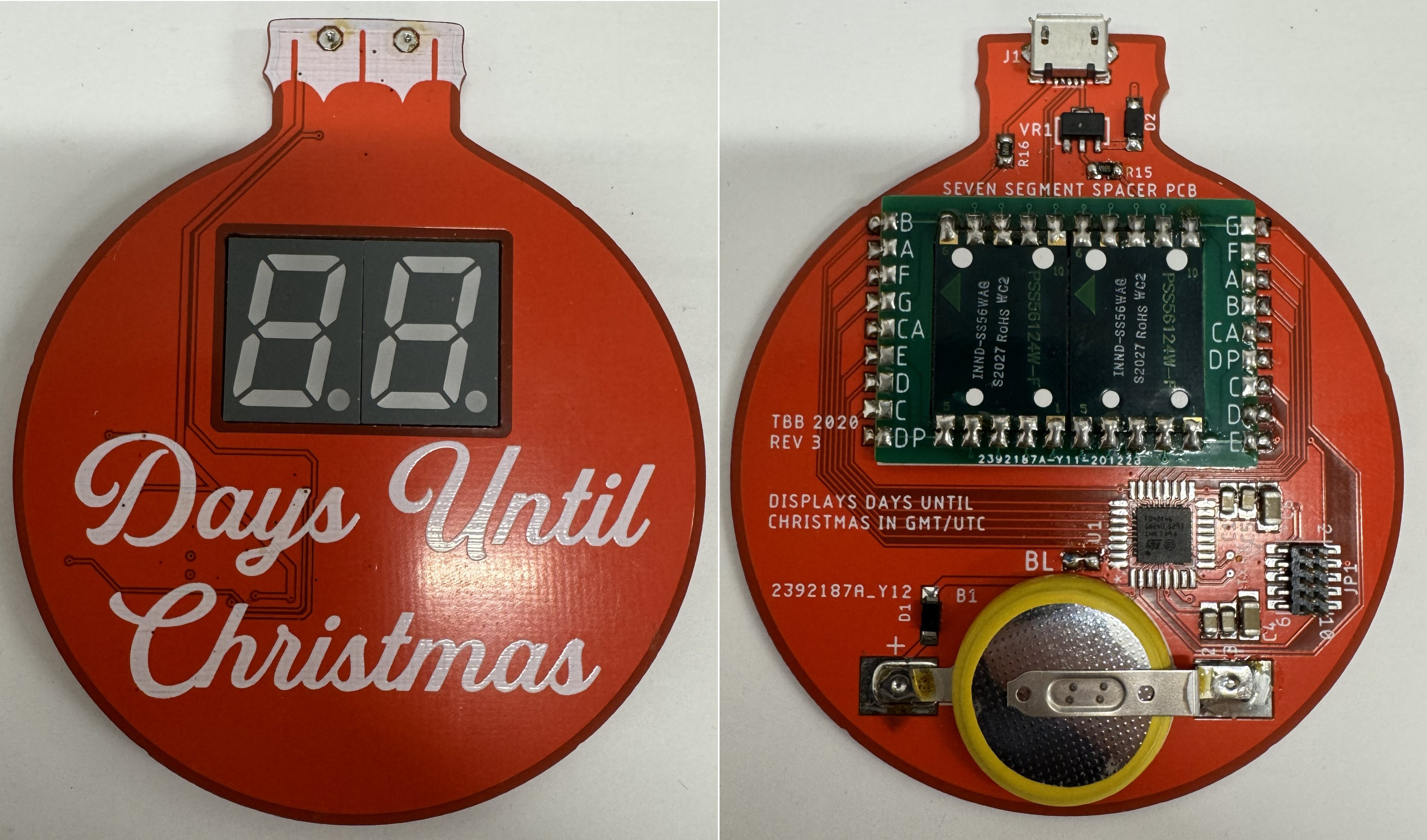 The bottom side side featured cursive words "Days Until Christmas", a simple bulb topper, and a full ground polygon with copper cutouts for the segments of the seven segment display. A handful of small vias were the only evidence of it being an electronic device visible from this side.