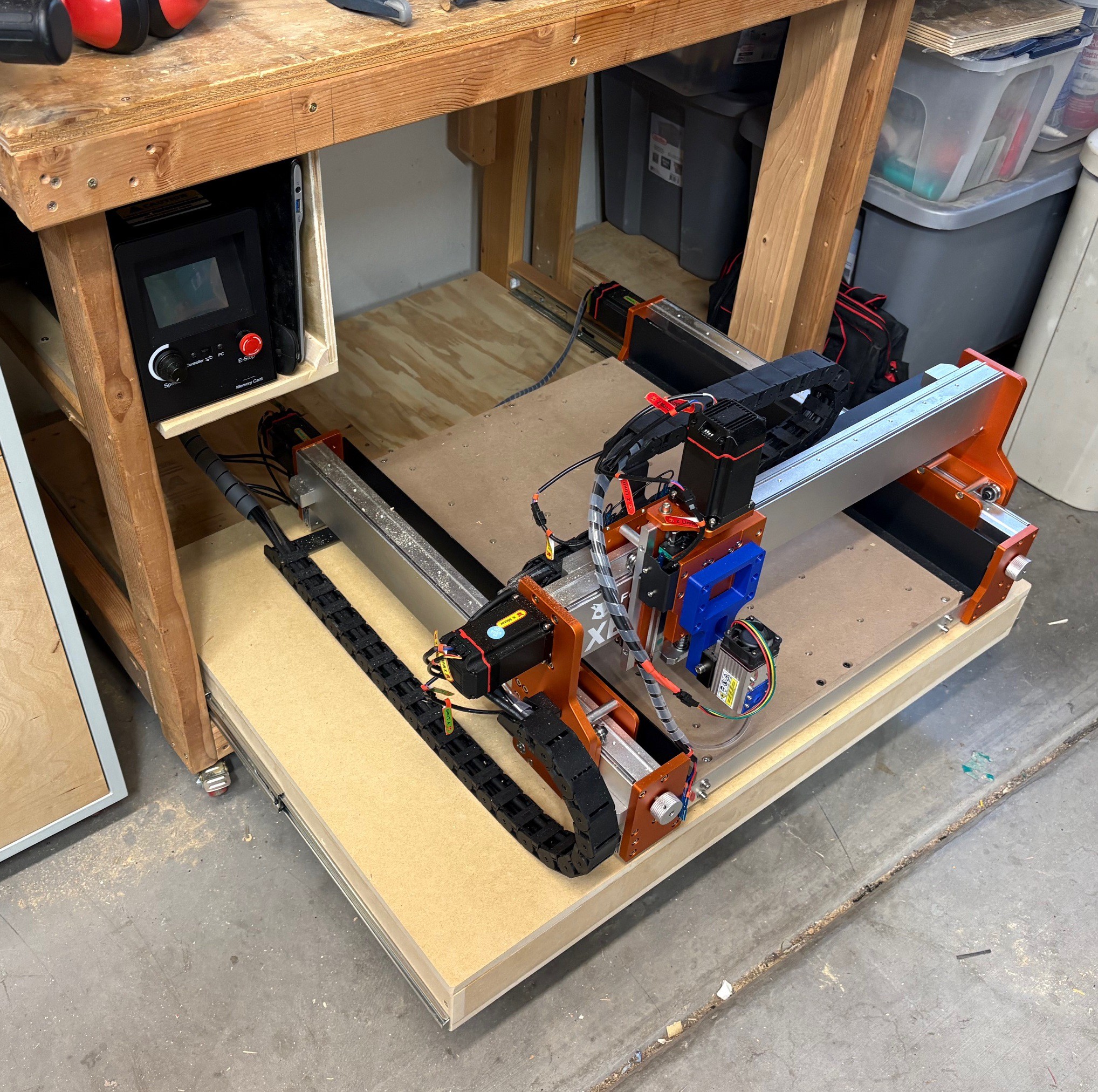 I love my new CNC, but my shop is very small (basically 3 feet deep in the back of the garage). I decided to move it down under my workbench, on a roll out shelf. This lets me get easy access, while keeping my bench for other projects.