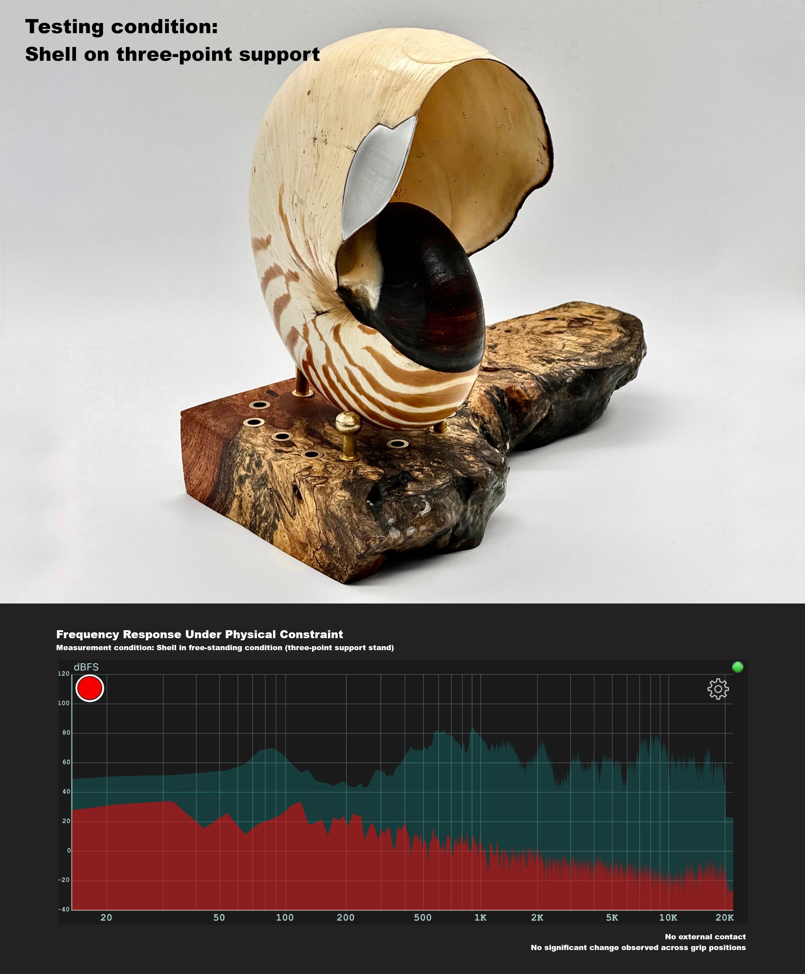 When the shell was placed on the custom minimal-contact stand (three-point support), a distinct change appeared in the low-frequency region. Compared to hand-held conditions, the measured spectrum showed a clear increase in energy around approximately 50-100 Hz. This low-frequency emphasis was repeatable and consistent.
