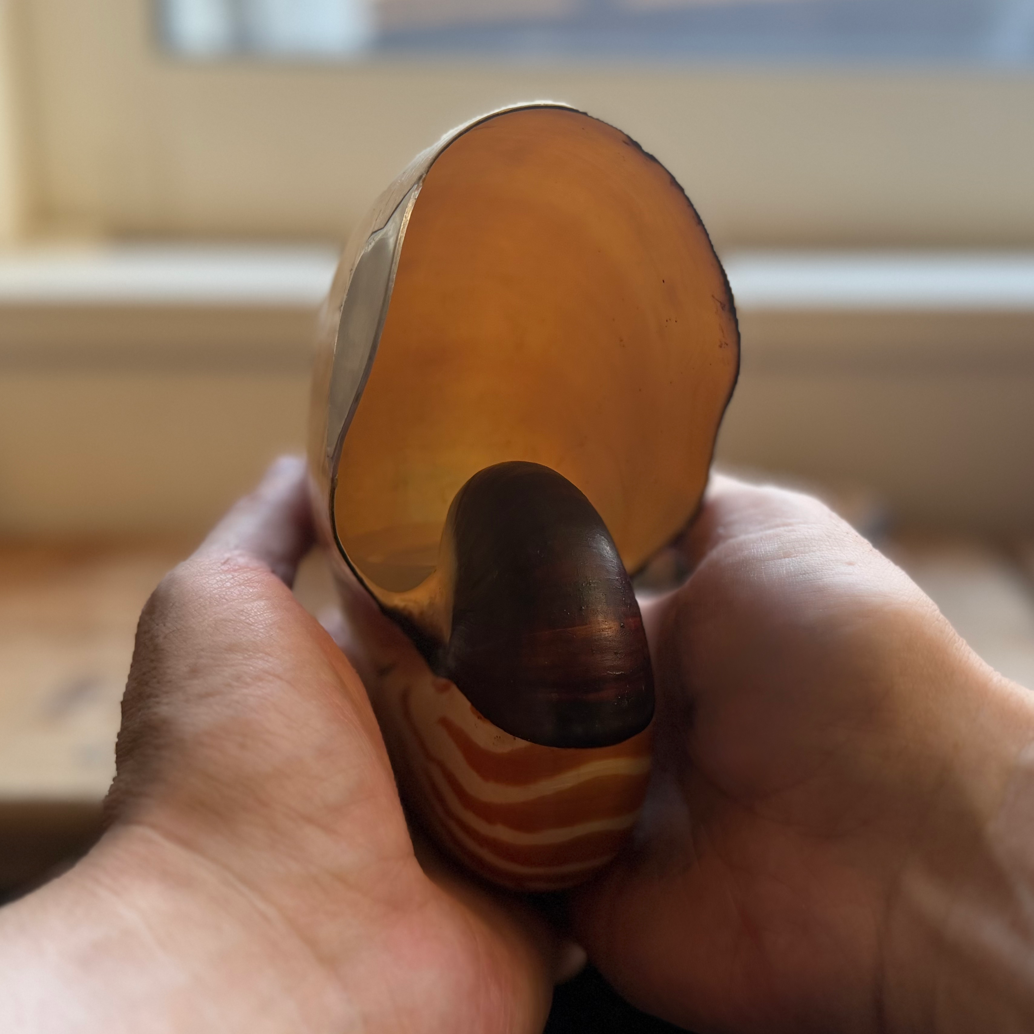 In particular, the shell showed a surprising robustness to touch: gripping or touching different areas of the outer shell had little audible effect, while changes in boundary conditions (such as supporting the shell on a stand) produced clearer differences in low-frequency response.