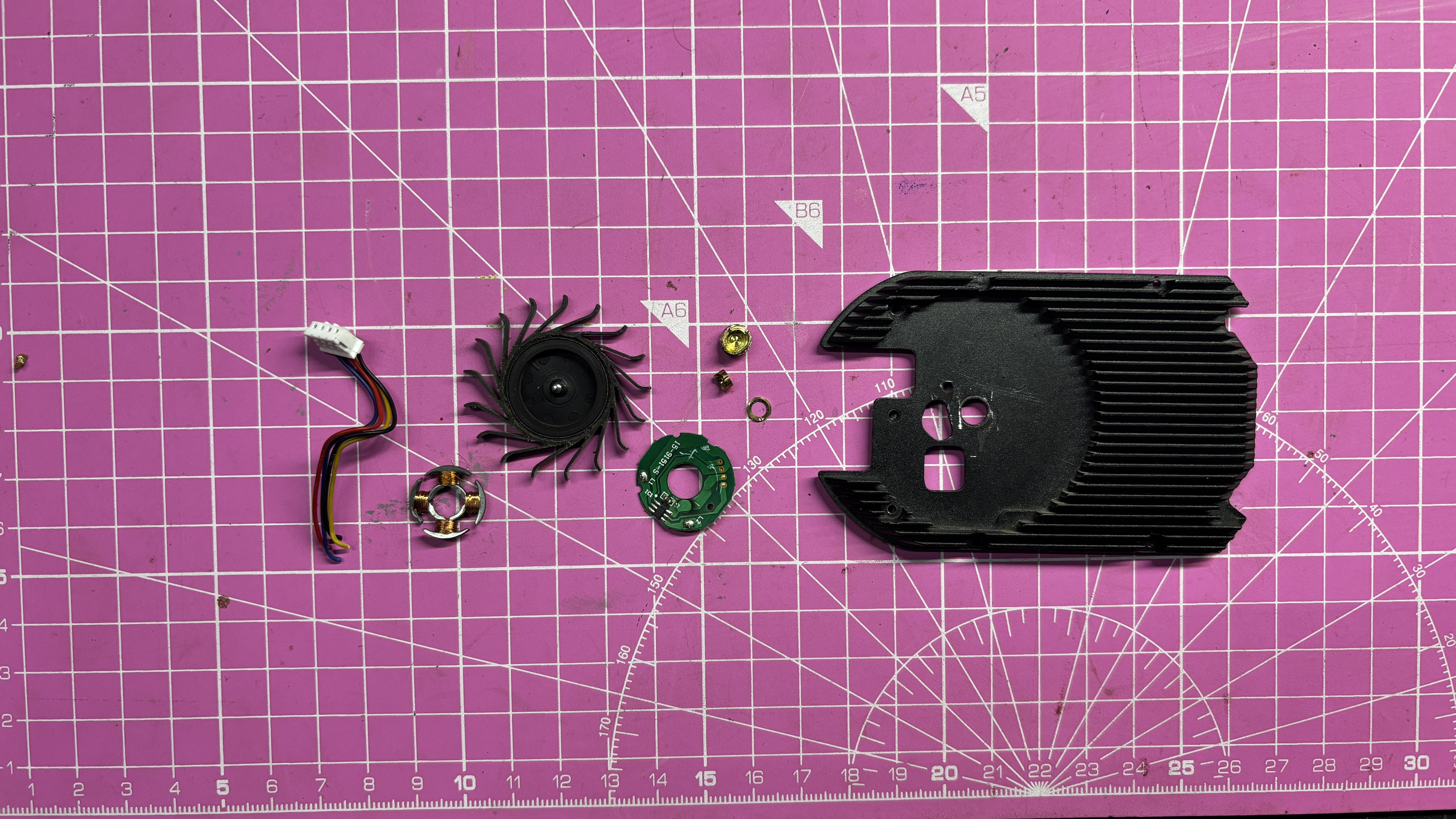 With the heatsink cleaned, we proceeded to remove the onboard fan from it. The fan was disassembled by first removing the rotor, followed by the stator assembly. The stator was connected to a small driver PCB, which was also removed completely, along with the brass bushing mounted in the heatsink.