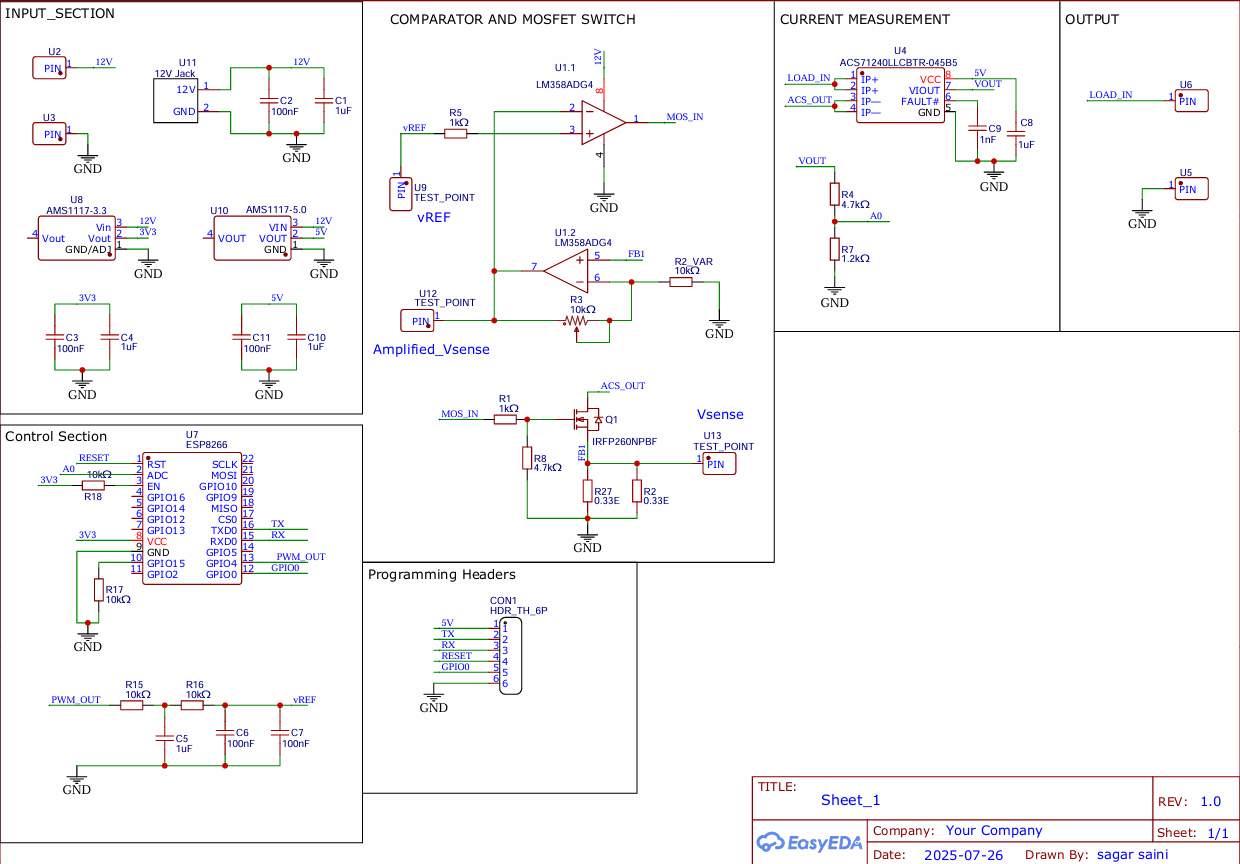 However, 165mV is a very small value, which is why I used an DC amplifier to raise the level by 2-3x. Then it is compared with the reference. The reference voltage is produced by potentiometers in the older design, but for digital control, we used the PWM method here. PWM duty cycle determines the voltage; for more information, please refer to the full details. After this, if we apply any voltage source across the terminals of Eload, it will start loading that supply. To maintain the set value and lock value equal, I have implemented an ACS712 current measurement and used a PID controller to fine-tune the PWM. This feature is currently under testing and will be fully updated within a week or so.