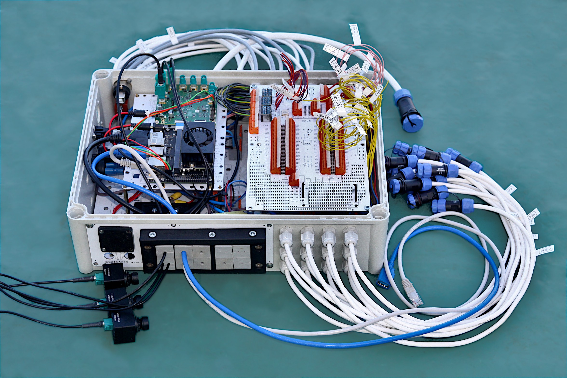 We call the 3 primary control modules Control Box 1, Control Box 2 and Safety Cameras. Box 1 is an infinitely hackable hardware system with a high end STM MCU, a set of automotive relays and automotive grade high side switches. Other sub modules in Box 1 include motor controllers and a 10 way fuse box. Box 2 can be configured in a similar way to Box 1 but would normally include a small board computer (SBC) for communication via 4G and crop detection with cameras and machine learning. WEEDINATOR Safety Cameras is a module for detecting the presence of people and a robot would normally have at least one at the front and back.