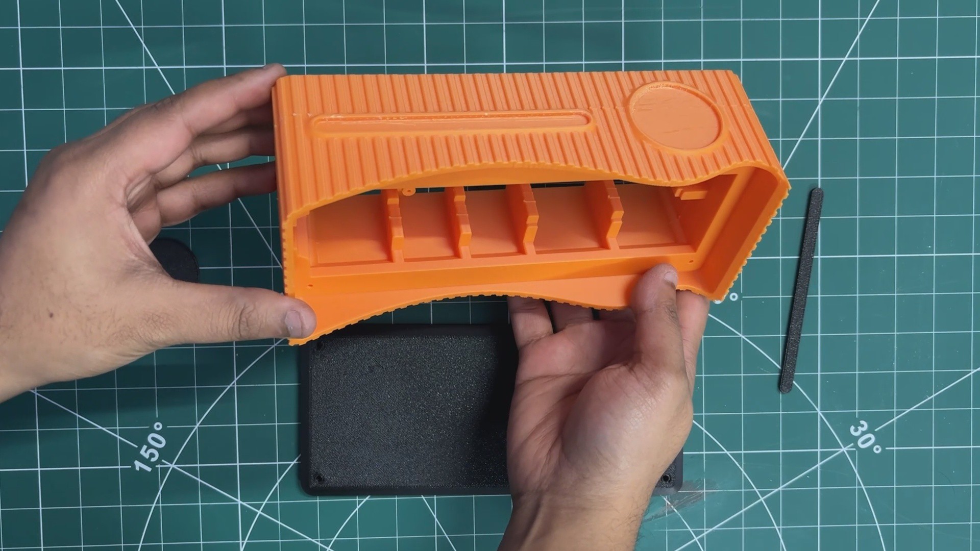 All components were exported as mesh files and then 3D printed on our Anycubic K10 printer. The main body was printed using orange PLA, while black PLA was used for the base and accent pieces to create a subtle contrast. We used Hyper PLA with a 0.4 mm nozzle, set the infill to 30%, and printed all parts without requiring any supports.