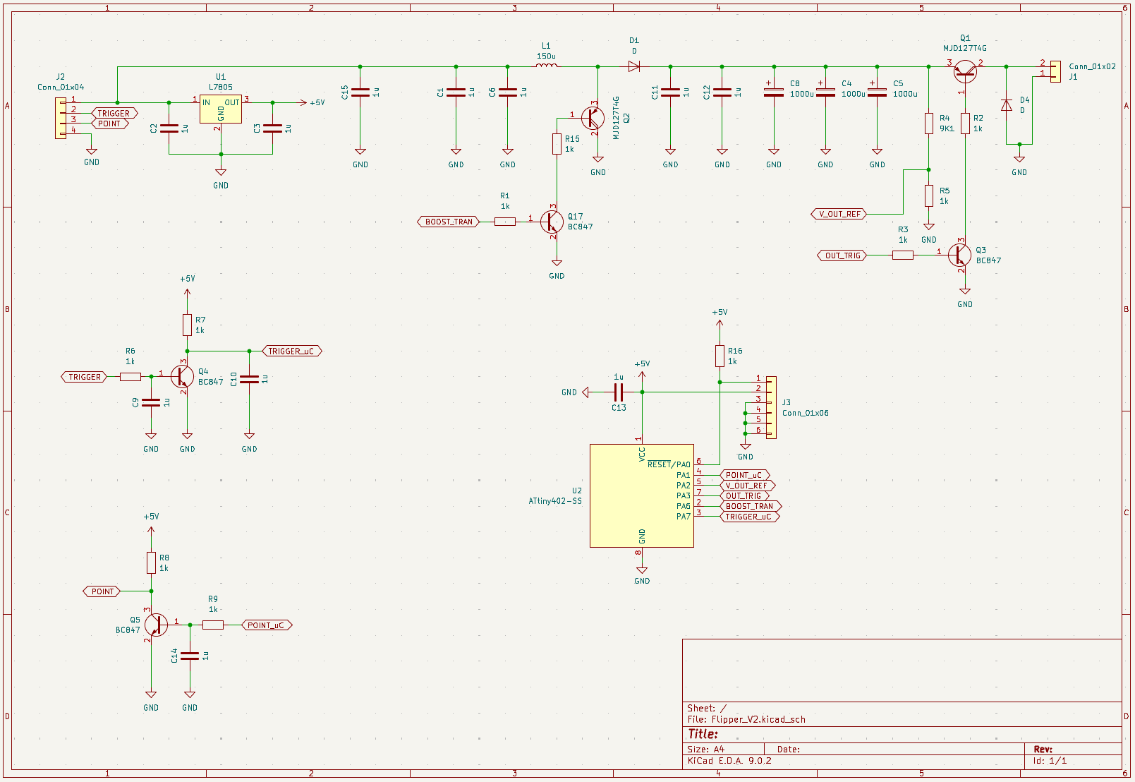The circuit is a easy onepager. Controlled by an ATTINY402 we use a Darlington-PNP and a inductance in a boost configuration to charge 3 tank capacitors. On a trigger another PNP is activated to output the voltage.