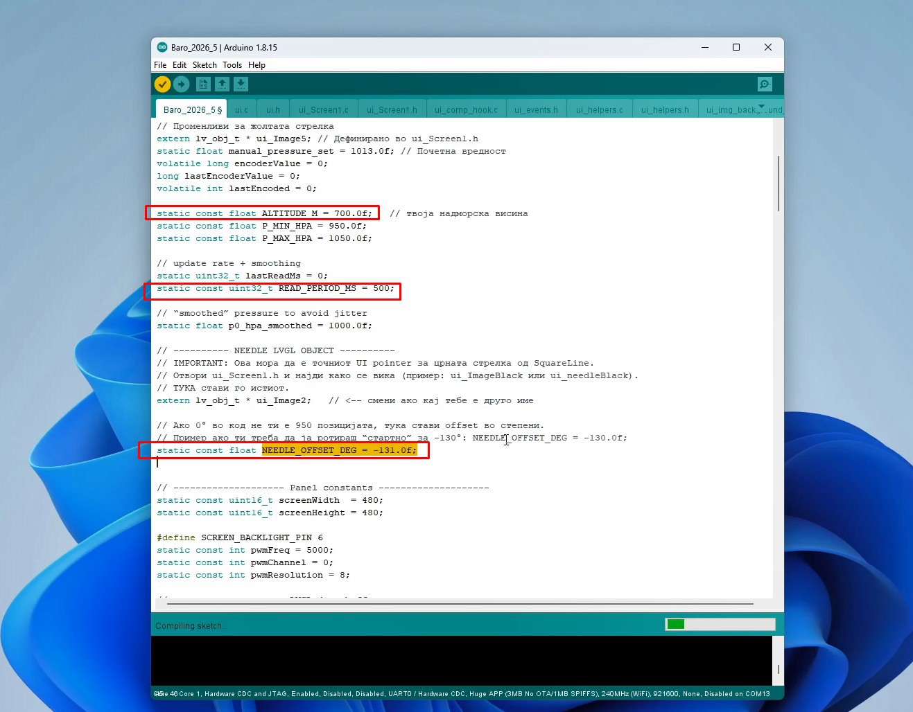 As for the code, it is made in a way that we can simply change several parameters for normal and precise functioning of the barometer:
