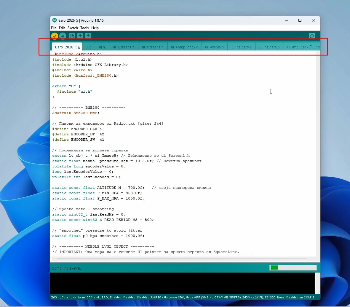 For this purpose we unpack the contents of the Code Final .zip file, without changing the name of the internal folder. We enter the folder and start the .ino file. In this way the code is opened together with the necessary UI files that were previously created with Squareline Studio. Now we can compile and upload the code without errors.