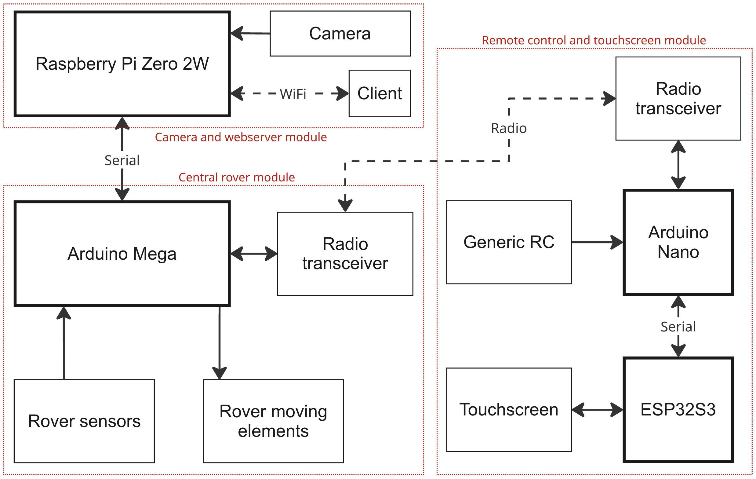 - Central rover module: It has an Arduino Mega development board that is inside the main body of the rover and that manages all moving elements (e.g., motors, servomotors) as well as the rover's sensors and sending/receiving the radio signal