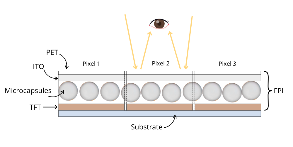 This arrangement allows each pixel to be individually addressed and the necessary voltages to be applied to achieve the desired color. Each electrode defines a pixel, which is actually made up of multiple smaller microcapsules — responsible for the granular appearance of the panel when viewed under magnification.