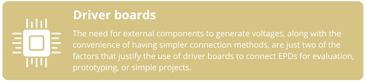 For these reasons, driver boards are used. They handle the generation of panel voltages and make it easier to connect with a microcontroller. These boards usually offer more convenient connectors and extra features such as battery charging, LEDs, push buttons, or SD card slots.