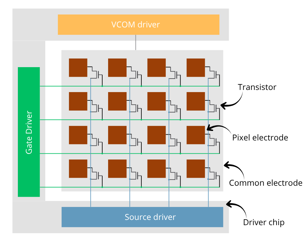 The transistors share the GATE line across each row and the SOURCE line across each column, while the drain is connected to each pixel. Inside the driver chip, the Gate Driver circuit controls the rows, the Source Driver controls the columns, and a third block manages the upper common electrode called VCOM.