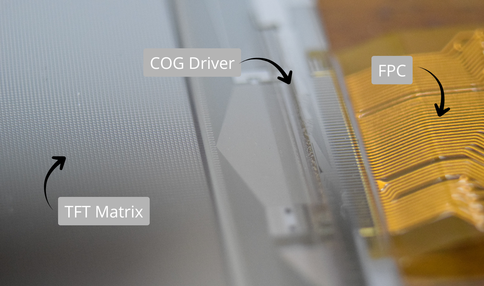 Back side of an EPD showing the TFT matrix, the COG driver, and the FPC connector