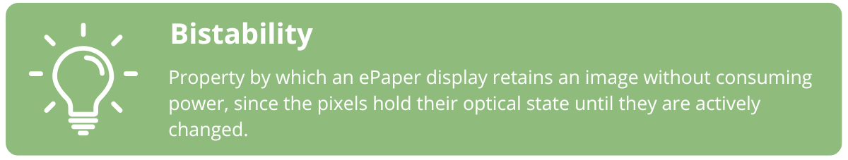 Still, you keep reading: Good visibility in different lighting conditions and decent resolution? Maybe an OLED display would work, with its bright colors. Or maybe an EPD could do the job, since it can show vibrant colors even in bright light… Wait, what was that thing about EPDs being bistable?