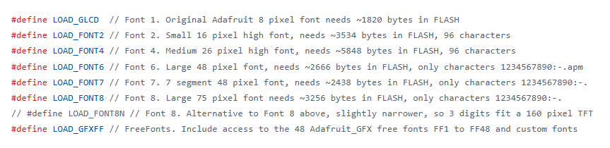 What these definitions mean is that you have 6 fonts available: 1, 2, 4, 6, 7, and 8. Each one has a different text size—some include all letters and characters, while others might only have numbers and a few symbols (the comments explain which is which).