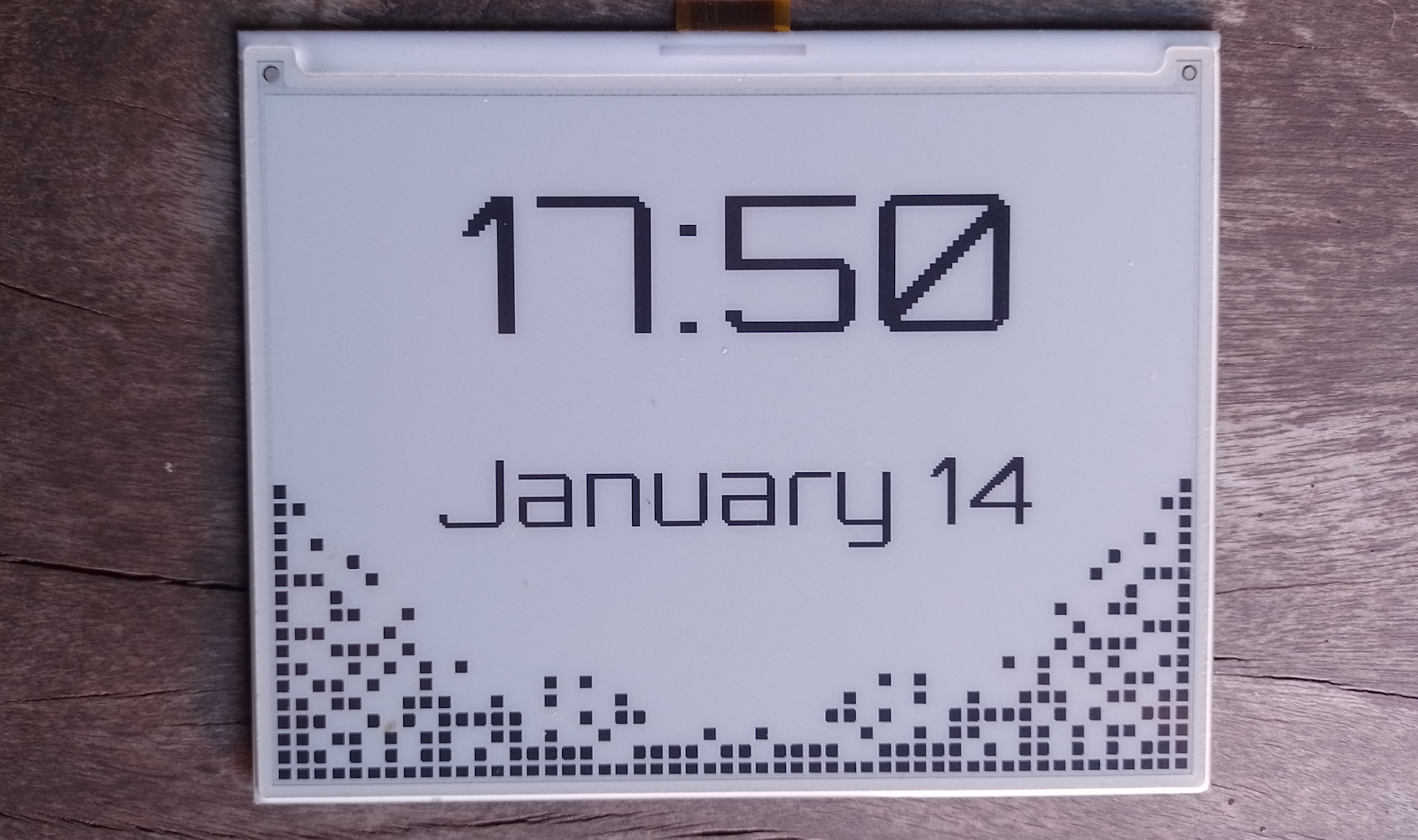 During the EPD initialization, you’ll notice the screen is cleared and a large custom font is selected—the font definition can be found in the library’s Fonts\Custom folder.
