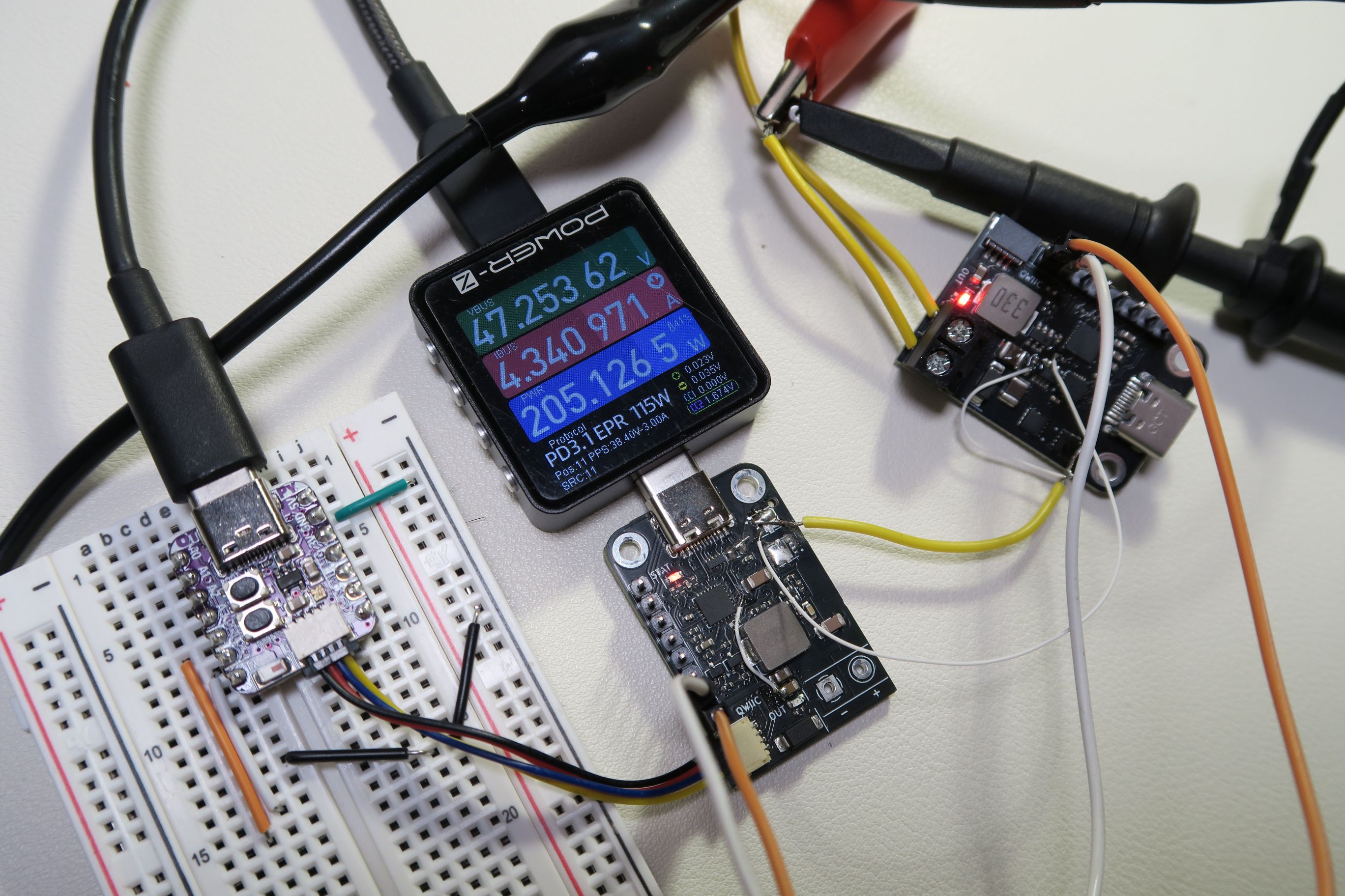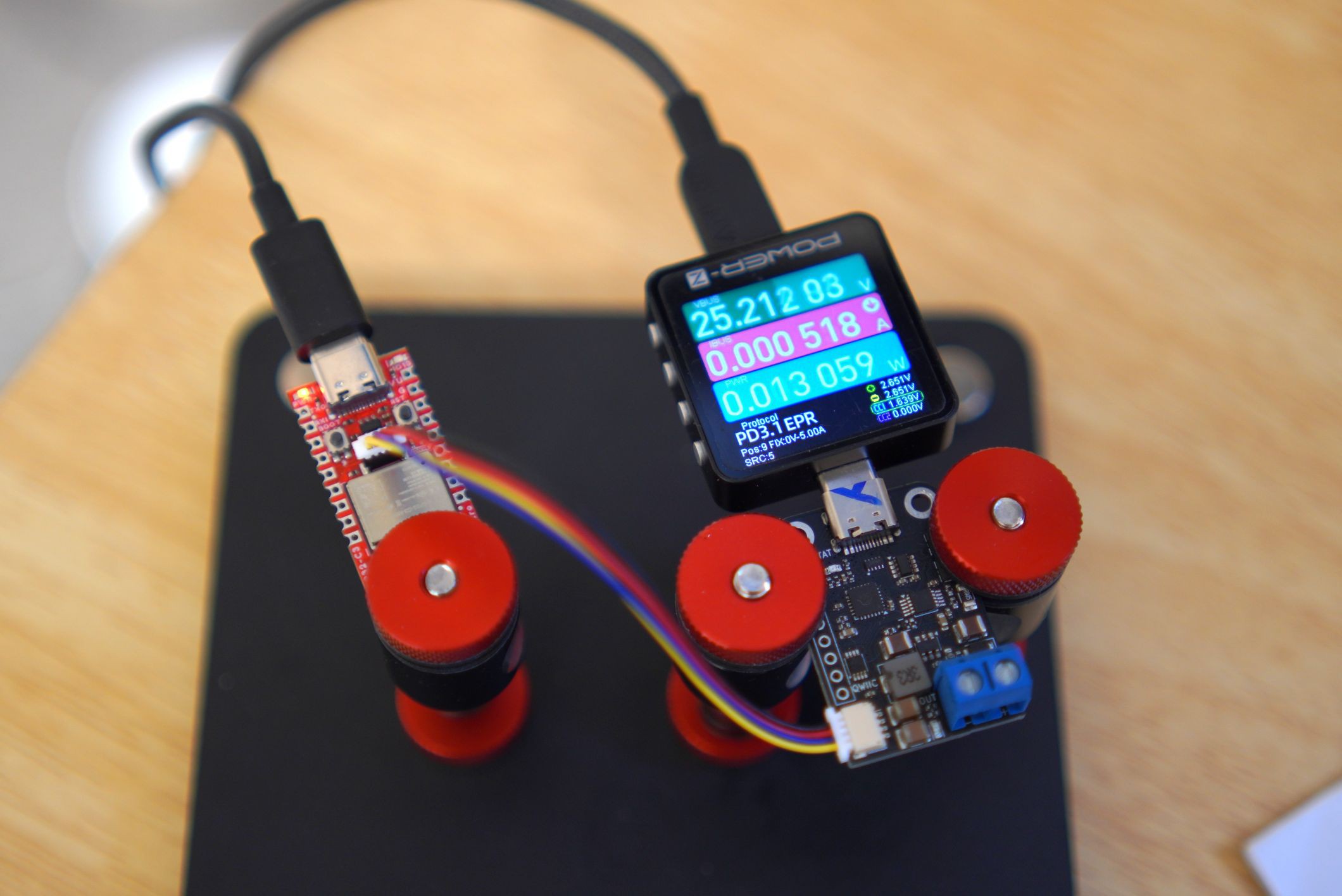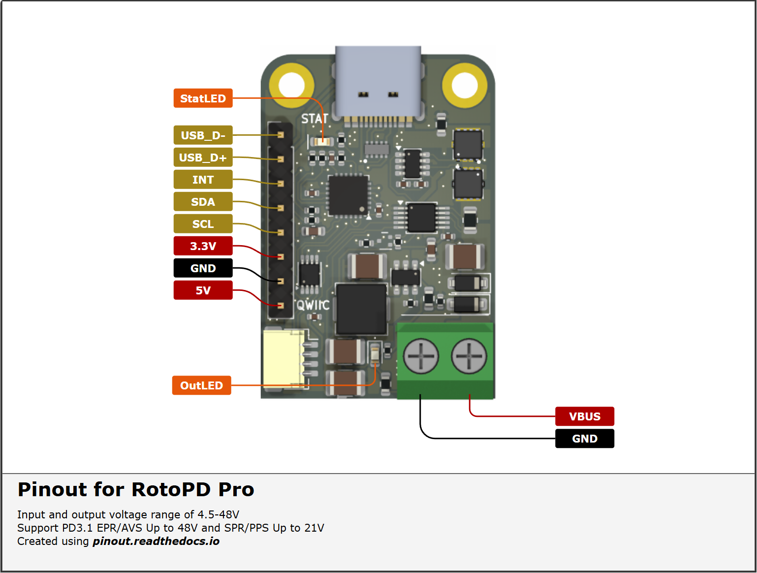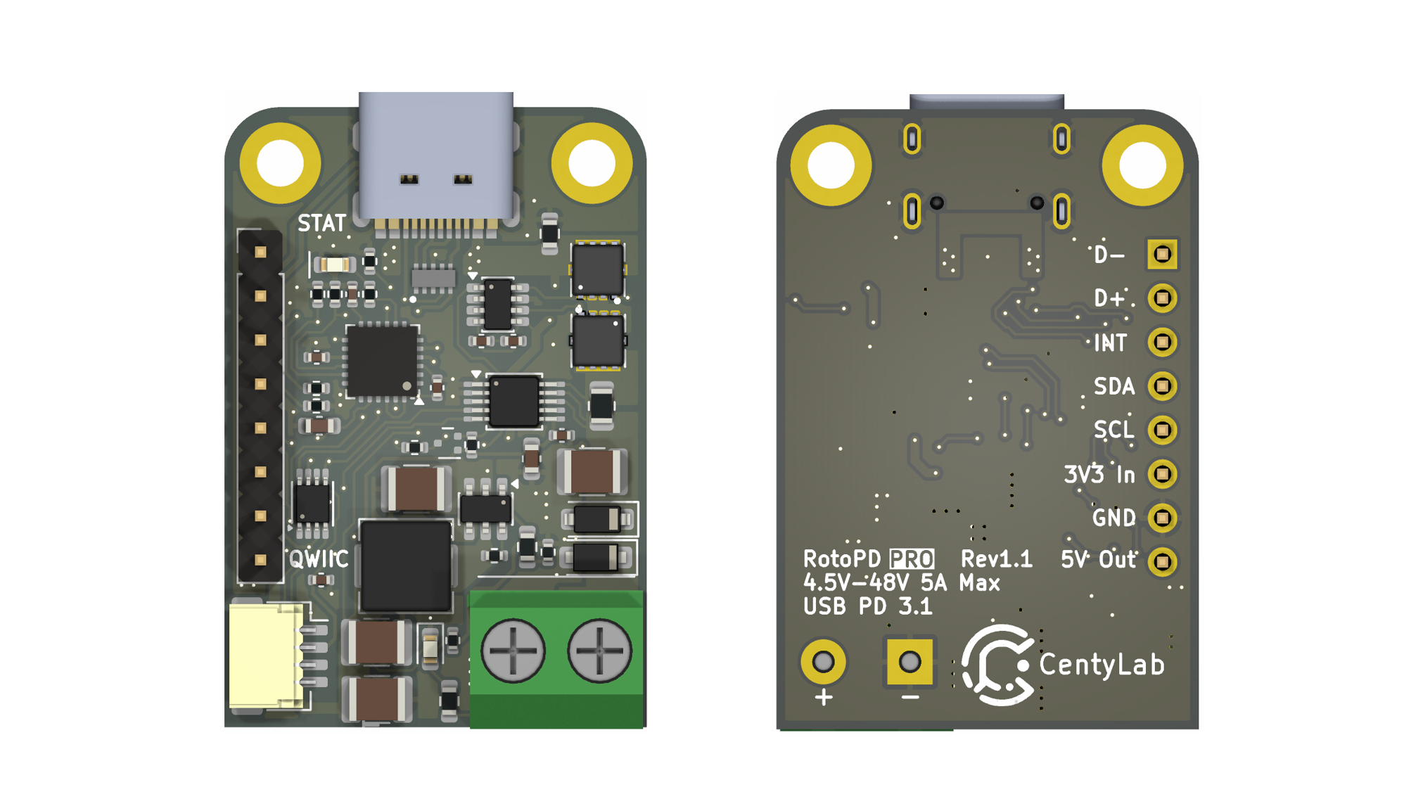 With the continuous improvement from the previous generation of RotoPD, our RotoPD Pro leverages advanced power delivery protocols 3.1 to achieve a full specification output range— 4.5V to 48V at 240W max. The breakout board use a stand alone Power Delivery Sink controller to negotiate with your modern charger and provide different output voltage.