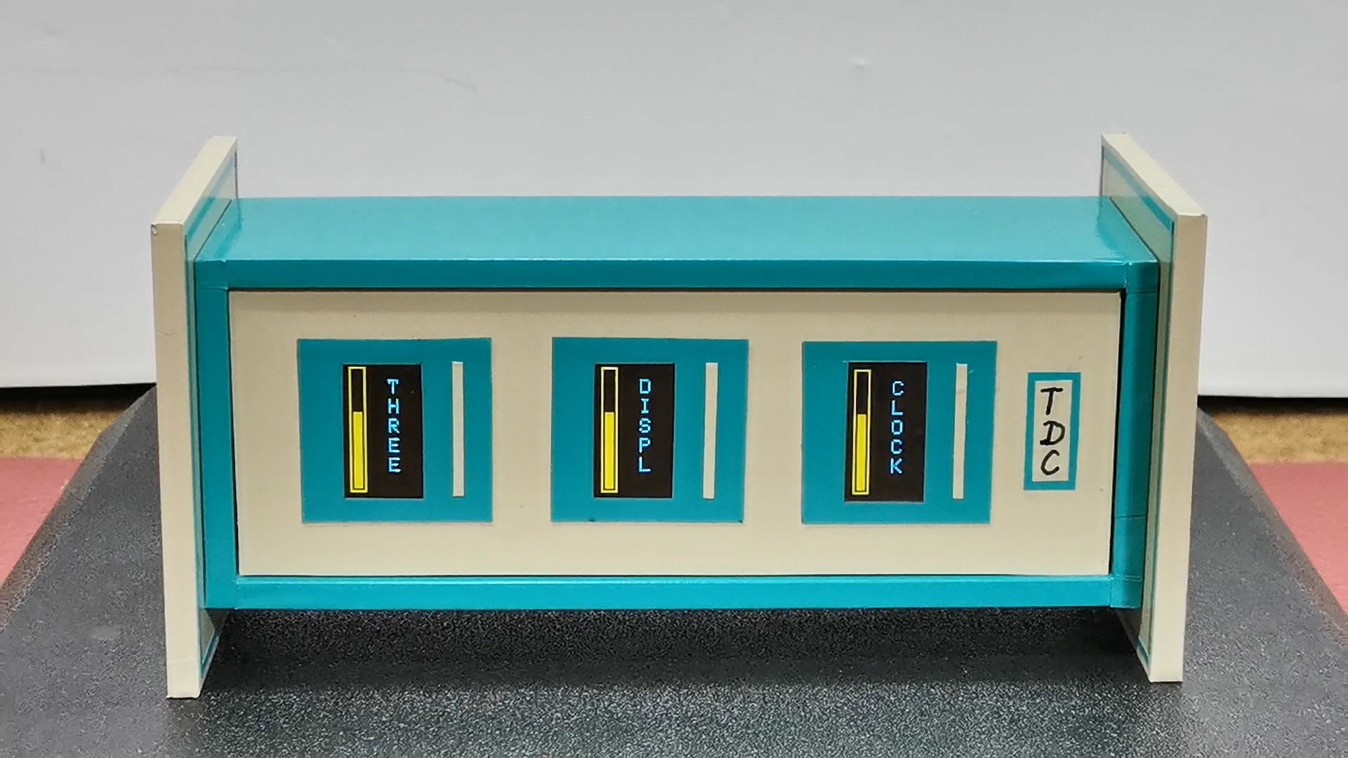 Now I propose to see how the clock works in real conditions. After switching on, the text "three display clock" appears sequentially on the three displays, an appropriate animation when writing the text, as well as rising and falling bars on the sides. Let's see how it works.