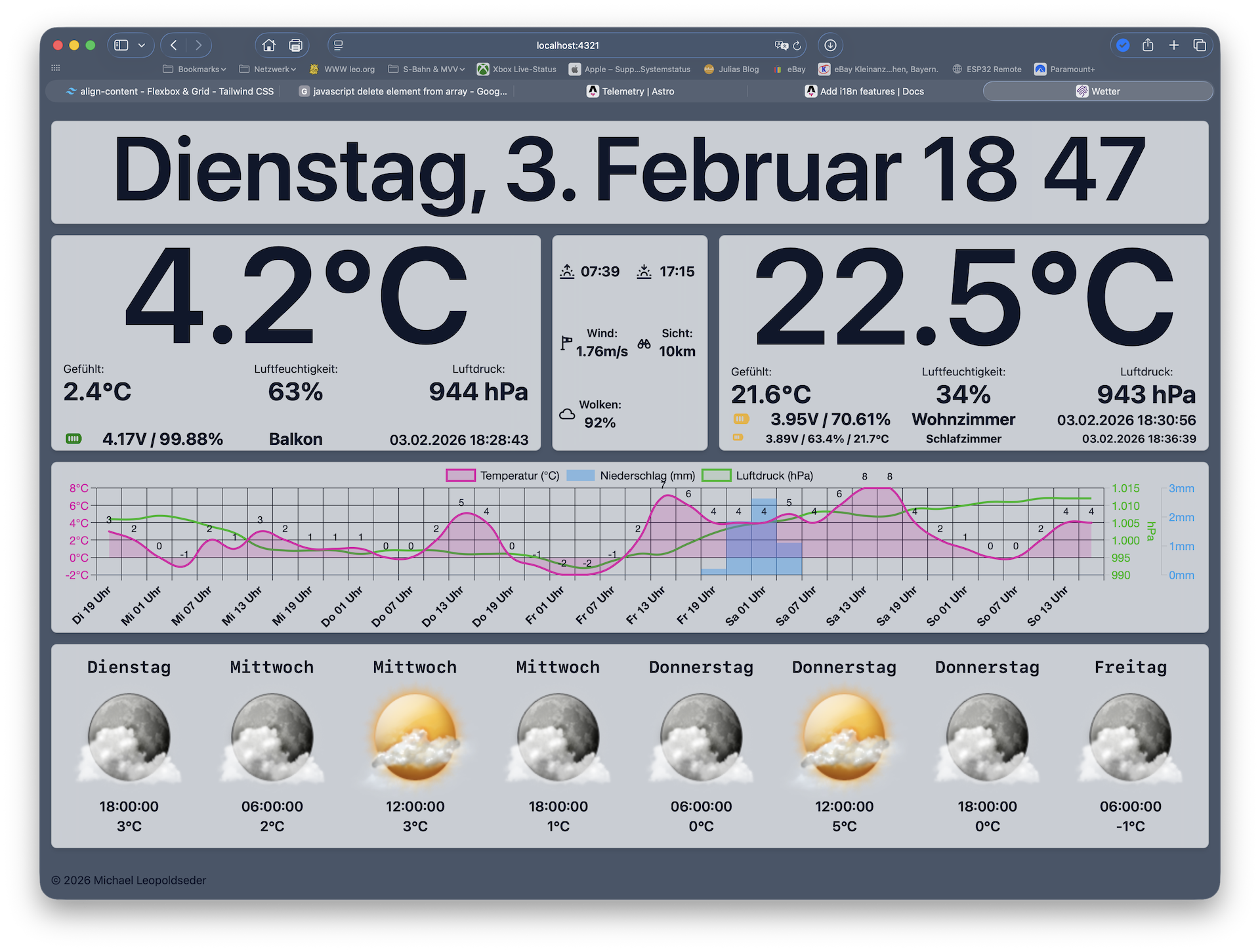 In addition to the display of the sensor values I used an free API from openweathermap.org to get a forecast for the next few days and these values are also displayed.