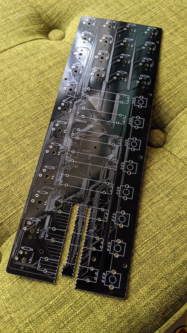 The project kicked off in September 2021. I started by mapping out every pin on the Teensy 3.5 and designing the schematic in Fusion 360's eCAD design tool. Each of the 24 buttons gets its own switch circuit with an LED driven through a current-limiting resistor, plus 16 analog inputs for the knobs and sliders. The Teensy sits on a pair of headers at the edge of the board. From there, I moved into PCB layout, routing all 64+ connections on a single board. Routing the bottom Teensy pins was the fun part. I went with a castellated hole approach so I could easily solder all the pins.