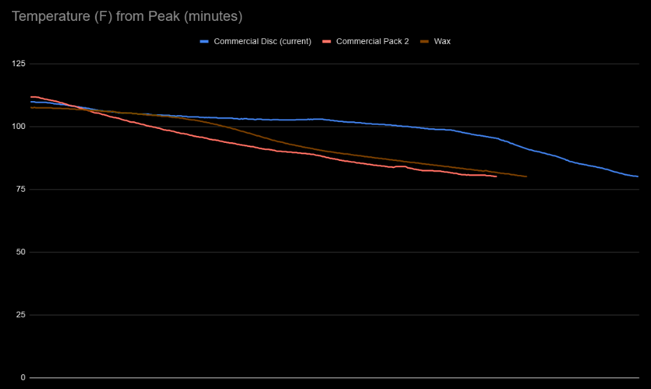 The first thing I noticed from the puck was that the temperature doesn't just drop linearly. After some googling, I realized it's likely because it's using what's called a Phase Change Material (PCM). These materials store a lot of energy in their phase change such that they hold near that phase change temperature for a long time before then cooling further. This means they have a nice stable max temperature associated with that phase change temperature threshold and they can hold a lot of energy. Makes sense why they'd be used!