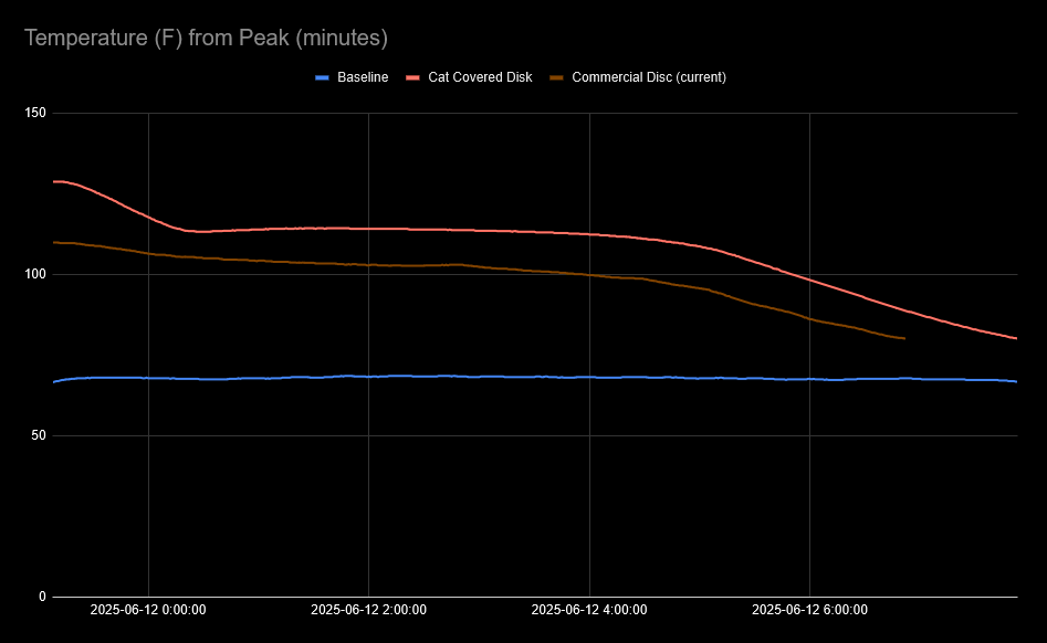 I'll note on these experiments we stopped when the temp dipped below 80F, at which point it would be generally considered useless, but we actually want it above 90-100 to be providing maximum value.