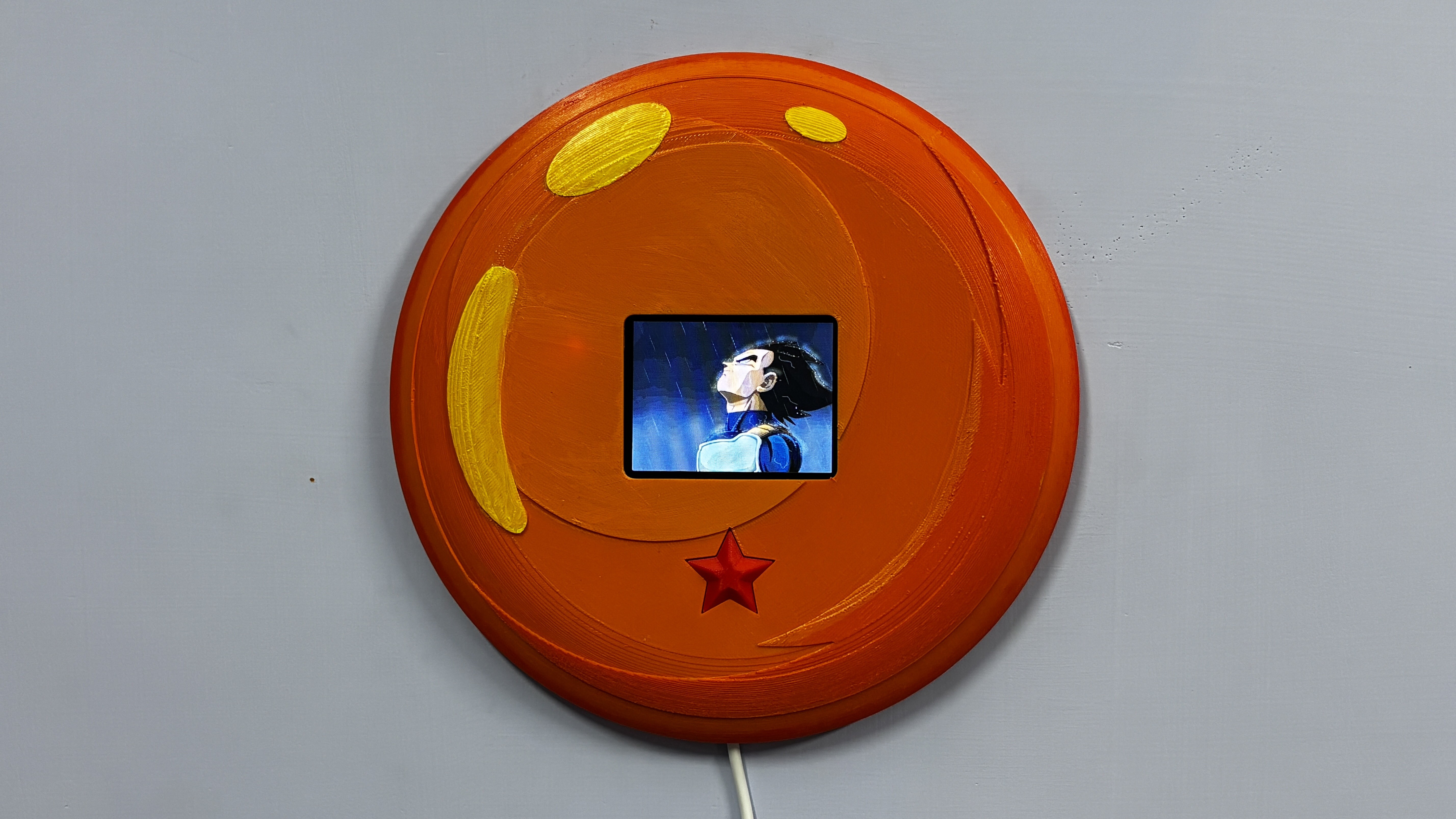 The Zenkai Engine consists of a full-size Dragon Ball enclosure and is powered by a UNIHIKER K10. When the external button that is shaped like a one-star Dragon Ball is pressed, the device plays a short animated sequence of Vegeta standing in rain along with a one-minute motivational speech. After inactivity, the display powers down to conserve energy, awaiting the next trigger.
