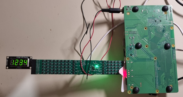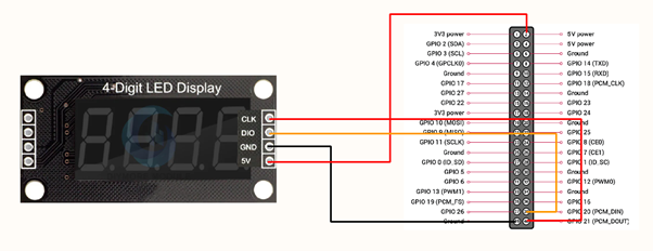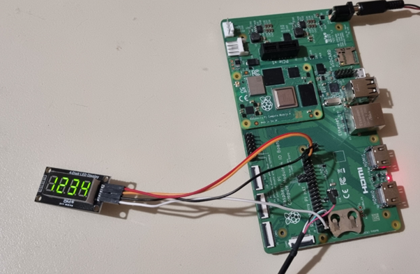 It’s a simple setup: a Raspberry Pi I/O board connected to a TM1637 LED module. Four jumper wires