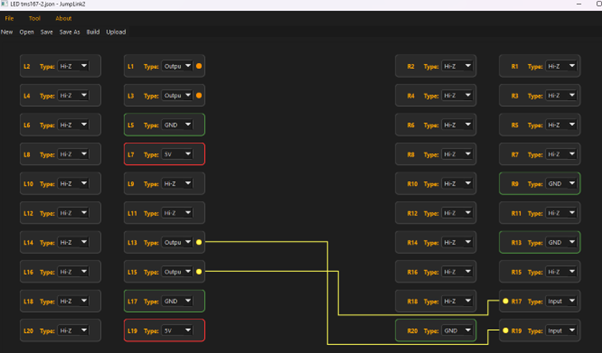 By comparison, using Jumperlink makes the setup much easier. As shown below, I configured GPIO20 and GPIO21 in the Jumperlink application to replicate the same connections as the jumper wires. The detailed configuration is as follows: