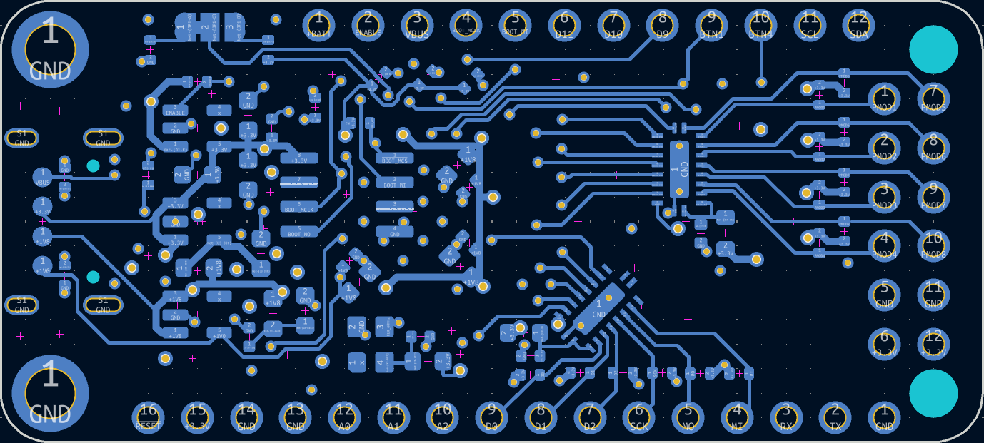 Further, I wanted to have buttons, LEDs, and a PMOD connector. This means that I would far exceed the amount of 3.3V logic pins and would need to some level shifting of the 1.8V pins. Even then, I needed to do a lot of doubling up on functions. In retrospect, this isn't that big of a deal. Different MCU boards to that sort of thing all the time, I'm just used to being spoiled by the copious amounts of IO that an FPGA typically provides.